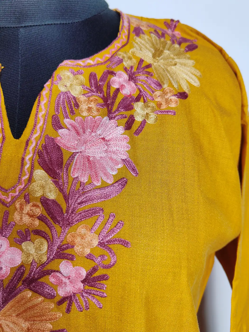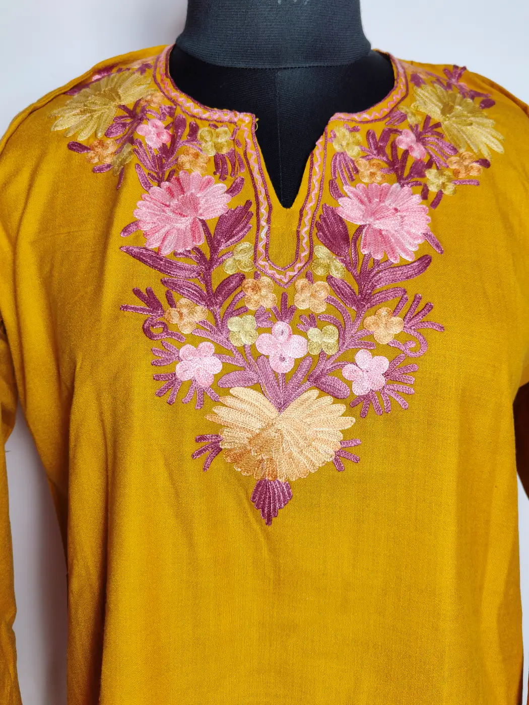 Styled in mustard hue ruby cotton, this short best cotton kurtis shows Kashmiri aari embroidery at neckline in floral motifs. It offers chest size 44 inches and length 30.