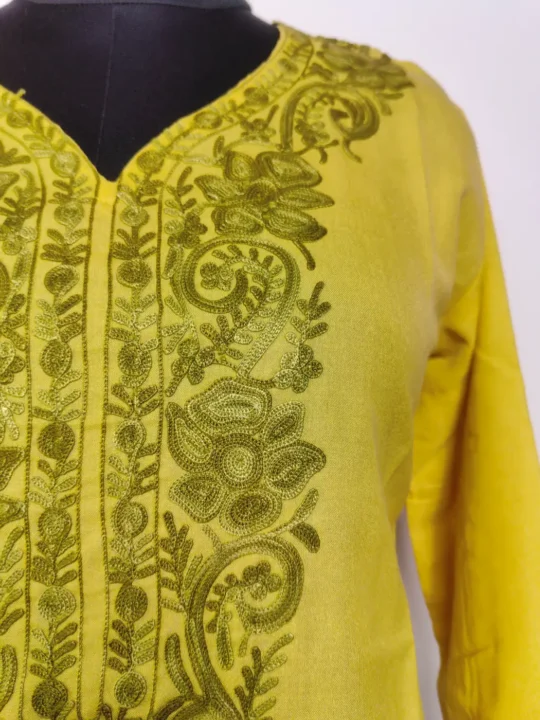 Created in summer cool cotton for warm days, this mustard colour kurta design features Kashmiri aari embroidery at neckline in floral and curved motifs. It offers breathable and easy wear.