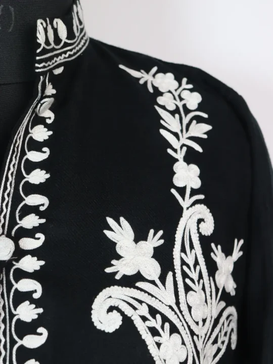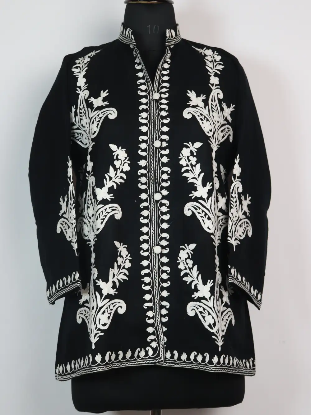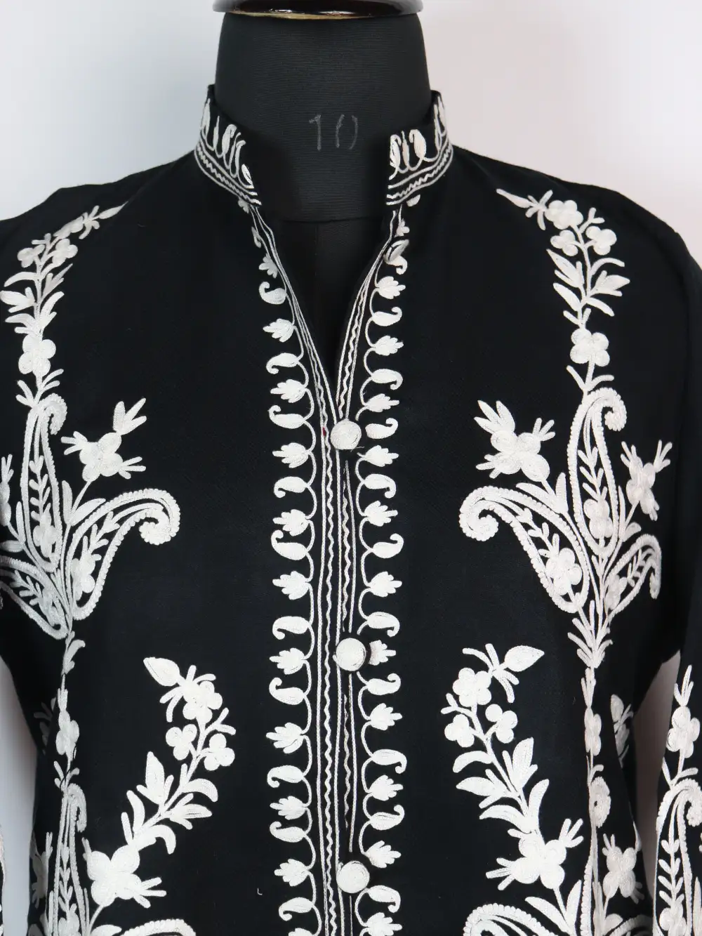 The short Mehreen coat combines warmth and elegant work in black Cashmilon wool. White floral and tiny badam Aari embroidery traces its borders beautifully. With a 44-inch chest measurement, this coat allows free movement while layering comfortably. It has lining attached for additional warmth, this coat blends cozy winter functionality with charming design, which makes this jacket an ideal choice for cold-weather dressing.