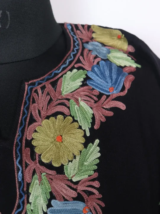 Made in cashmilon wool comes this black pheran set which comes as a 2pc set includes pheran with chest size 50 inches and length 43 inches and trouser 36 inches long. It carries floral Aari work at the neckline formed from repeated floral motifs.