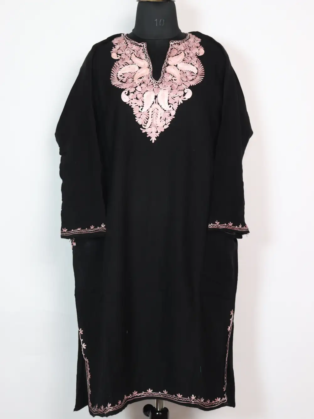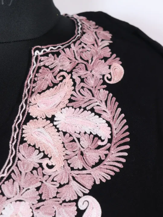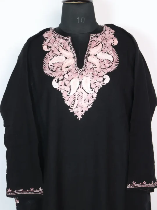Soft Cashmilon wool in black and Aari kaam at the neckline in badam style florals. Chest size 52 and length 42 gives you a roomy fall, this black Pheran feels warm and graceful — you can buy phiran online right now at just 1299 for easy ordering.