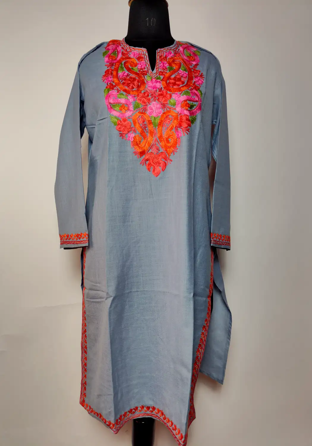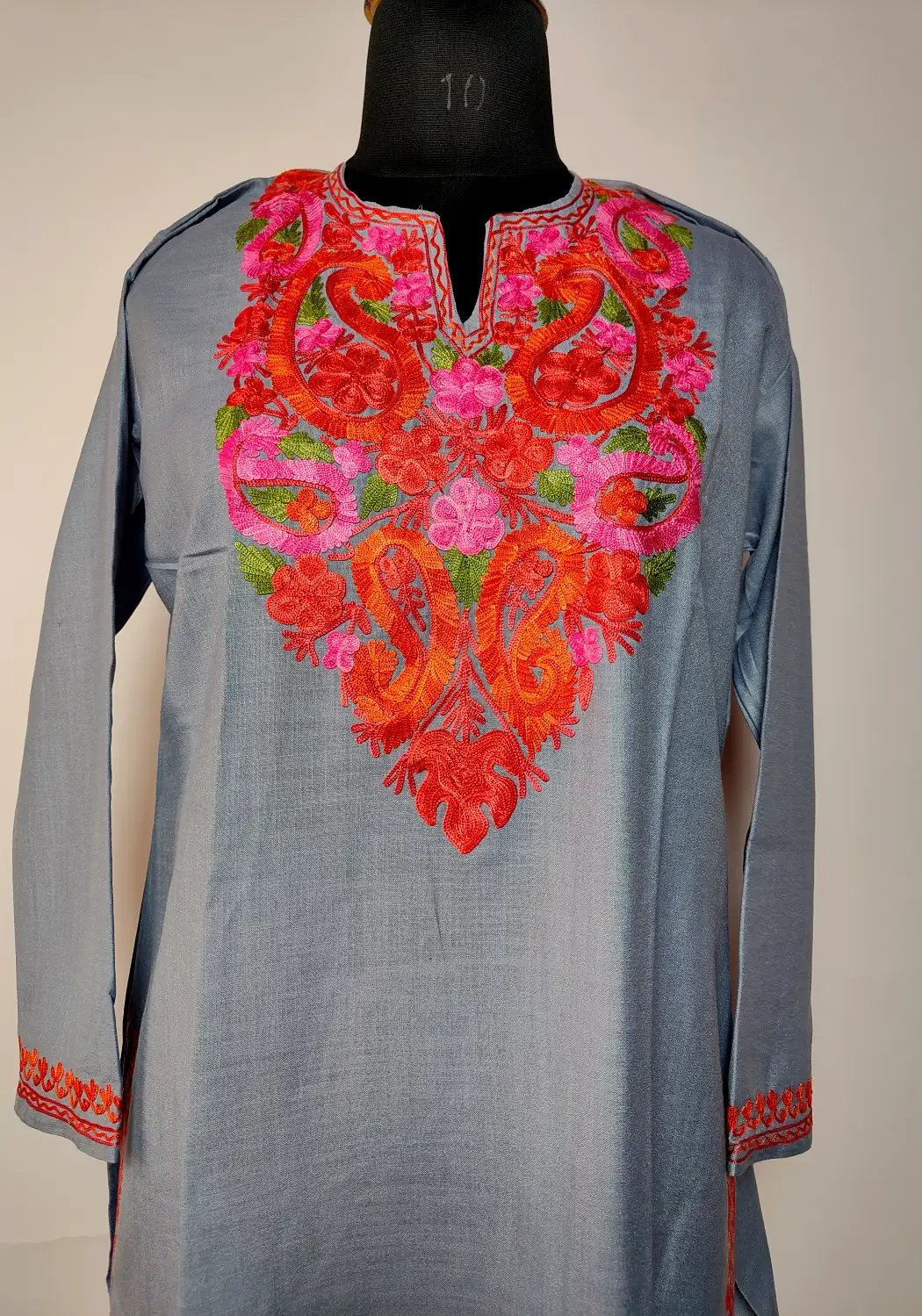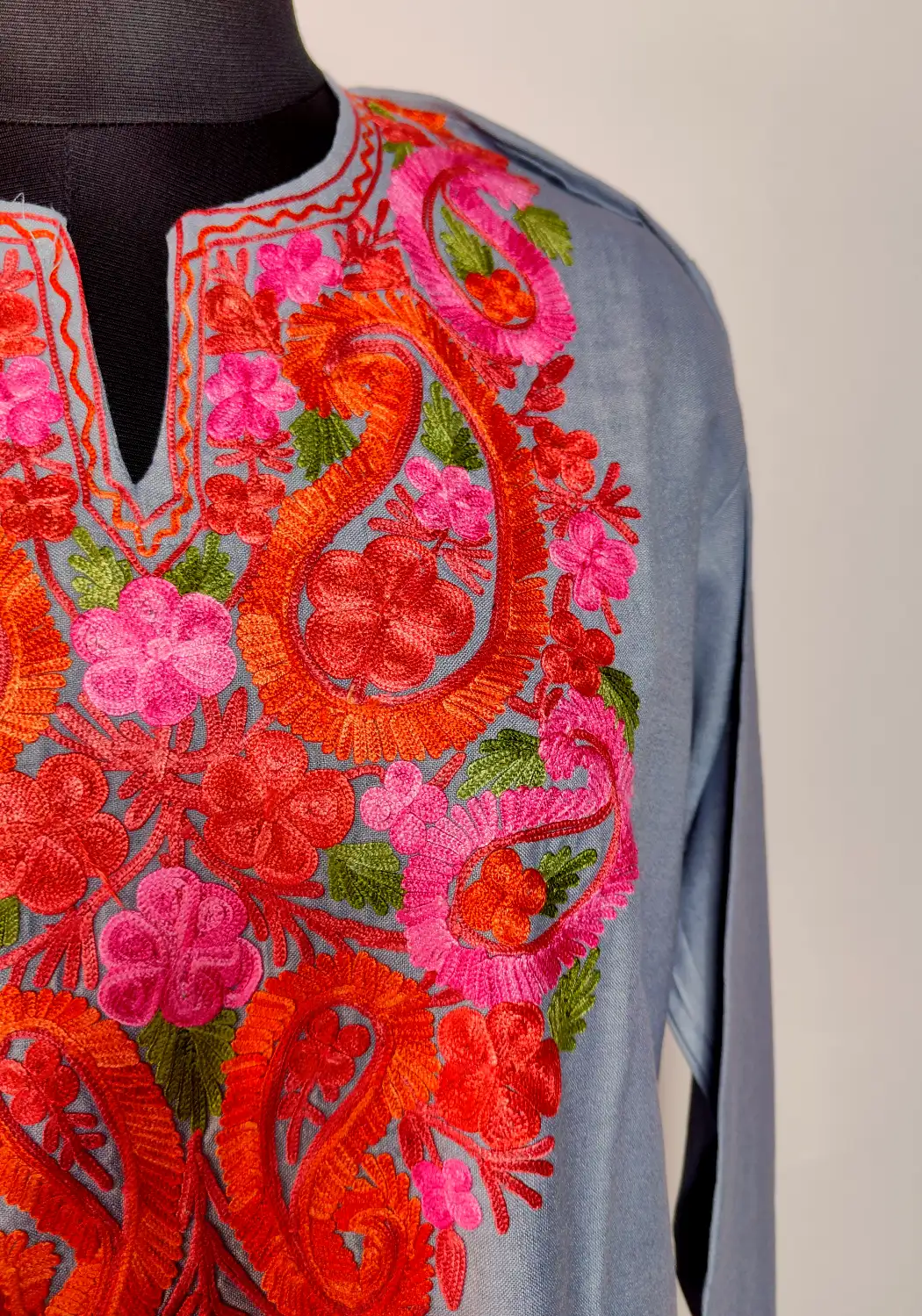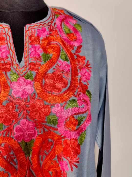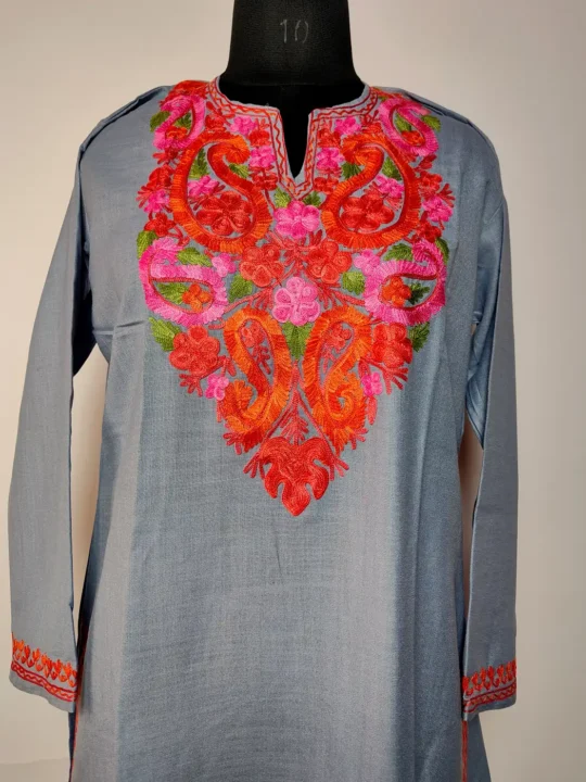 Designed for ease, this kurti piece with aari work design comes in grey ruby cotton with a smooth finish. Floral embroidery at the neckline brings in subtle detail, while the rest remains clean, which gives the kurti a balanced and wearable traditional appeal.
