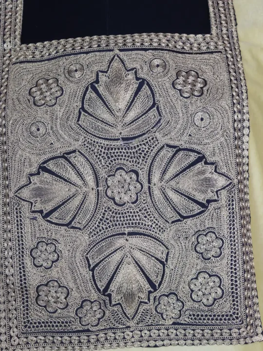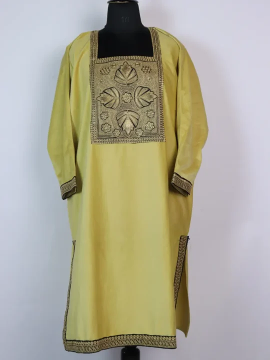 Crafted from rich velvet, this yellow pheran feels regal and warm. Its embroidery brings uniqueness with chinar-inspired motifs arranged in a star-like shape inside square boxes, which are stitched in golden threads. The fabric’s sheen complements the embroidery’s fine detailing, which makes it a graceful choice for winter occasions. Both cozy and stylish, this pheran adds elegance with every wear.