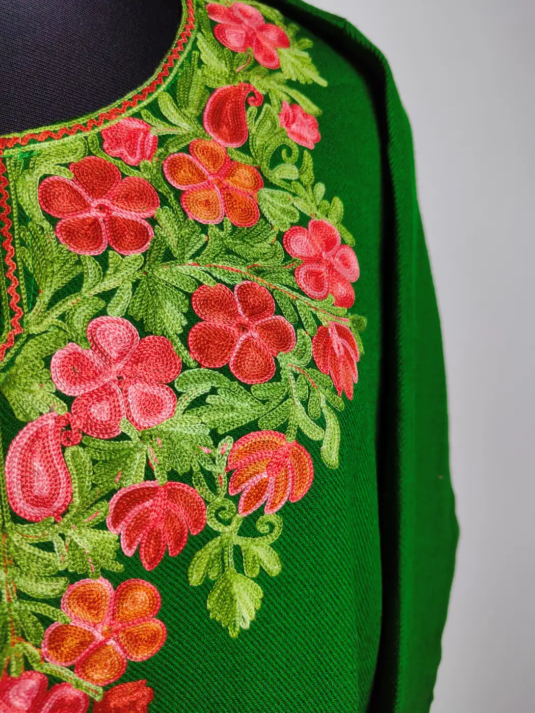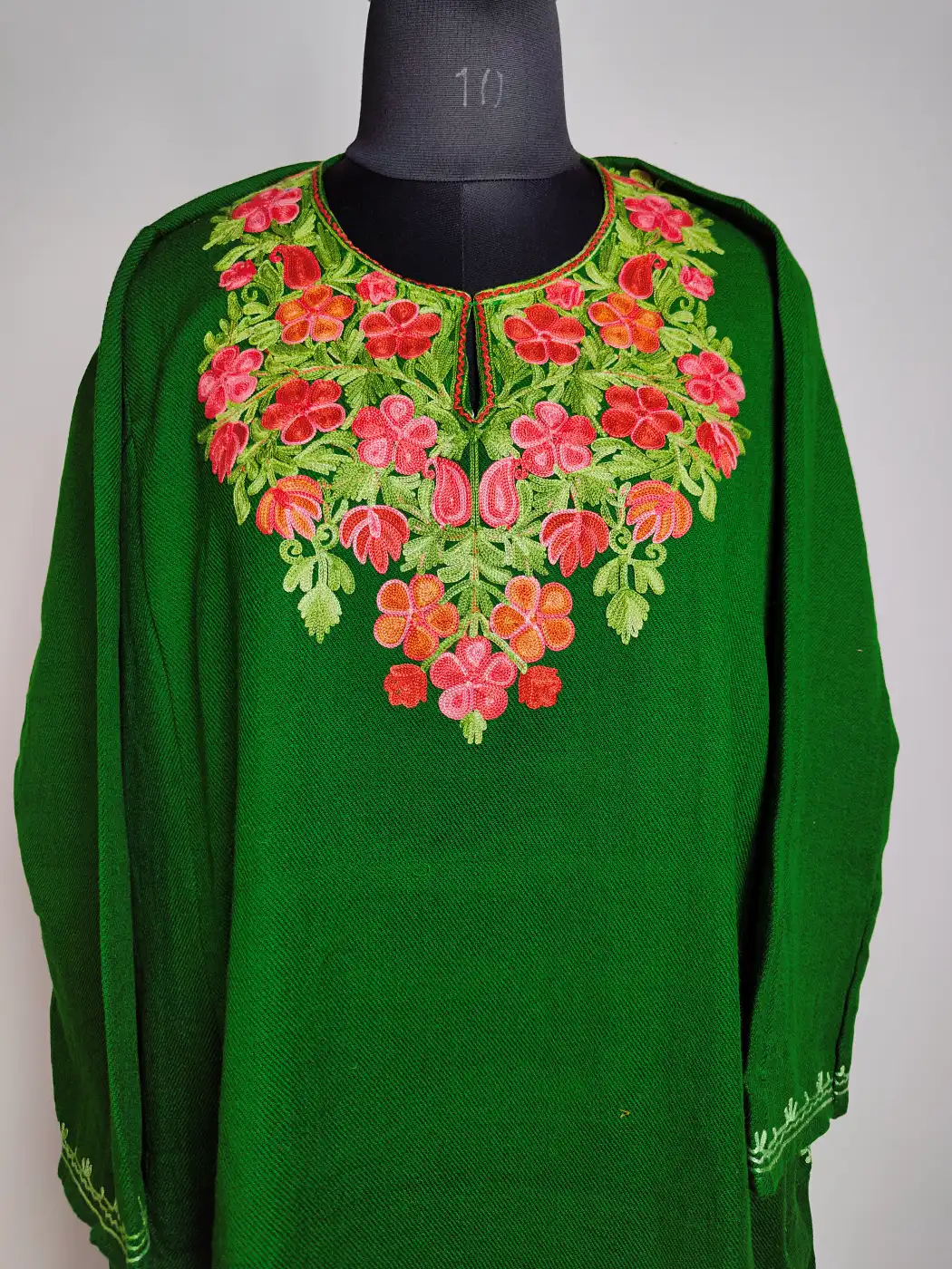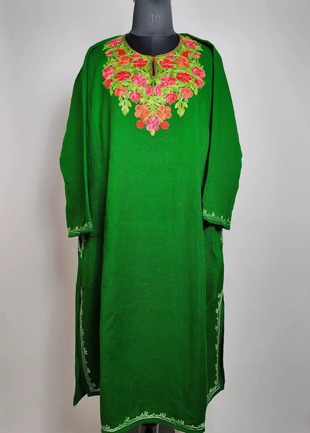 Crafted from warm cashmilon fabric, this pheran has a calm and natural fall. The neck is detailed with fine colorful floral aari embroidery that adds charm to the overall design. It works well for daily winter dressing.