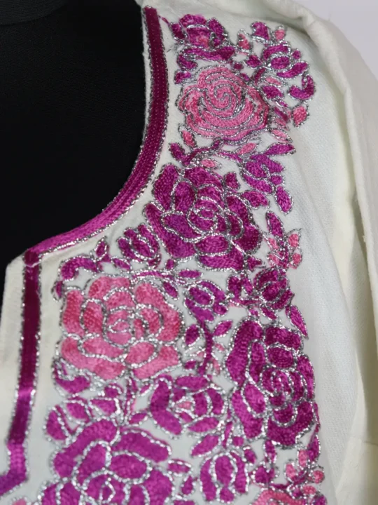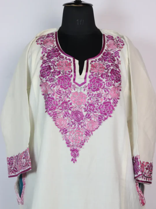 Designed with subtle elegance, this mustard color pheran is made in cashmilon wool. The purple floral work neckline, cuffs and the border enhanced with zari embroidery which makes the piece stand out,. It is cozy, warm, and light to wear, it creates a balance of beauty and everyday usefulness. Perfect for adding artistic expression to winter wear.