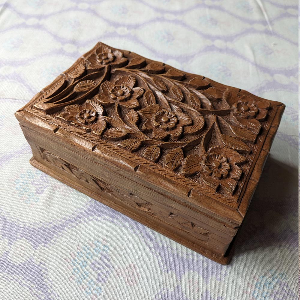This is a hand-picked jewelry box crafted by a skilled Kashmiri craftsman Length of this box is 8.5 inches, breadth is 5.3 inches and height is 3 inches.