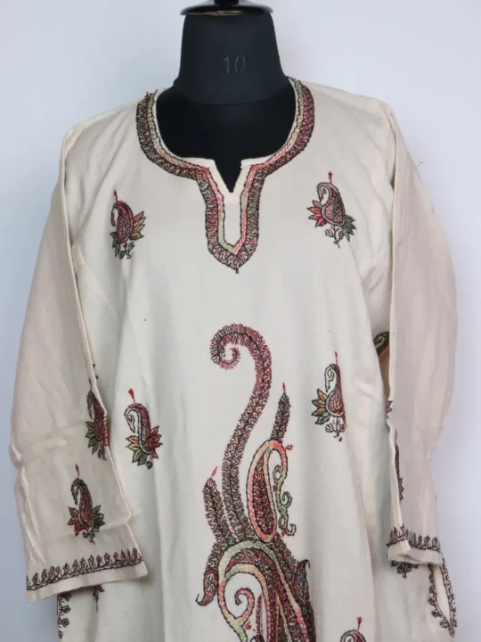 Kashmiri pheran dress carries raffal warmth with gentle Kashmiri charm, it is detailed with sozni embroidery placed along the neckline and huge motif and booti work all over the front panel.