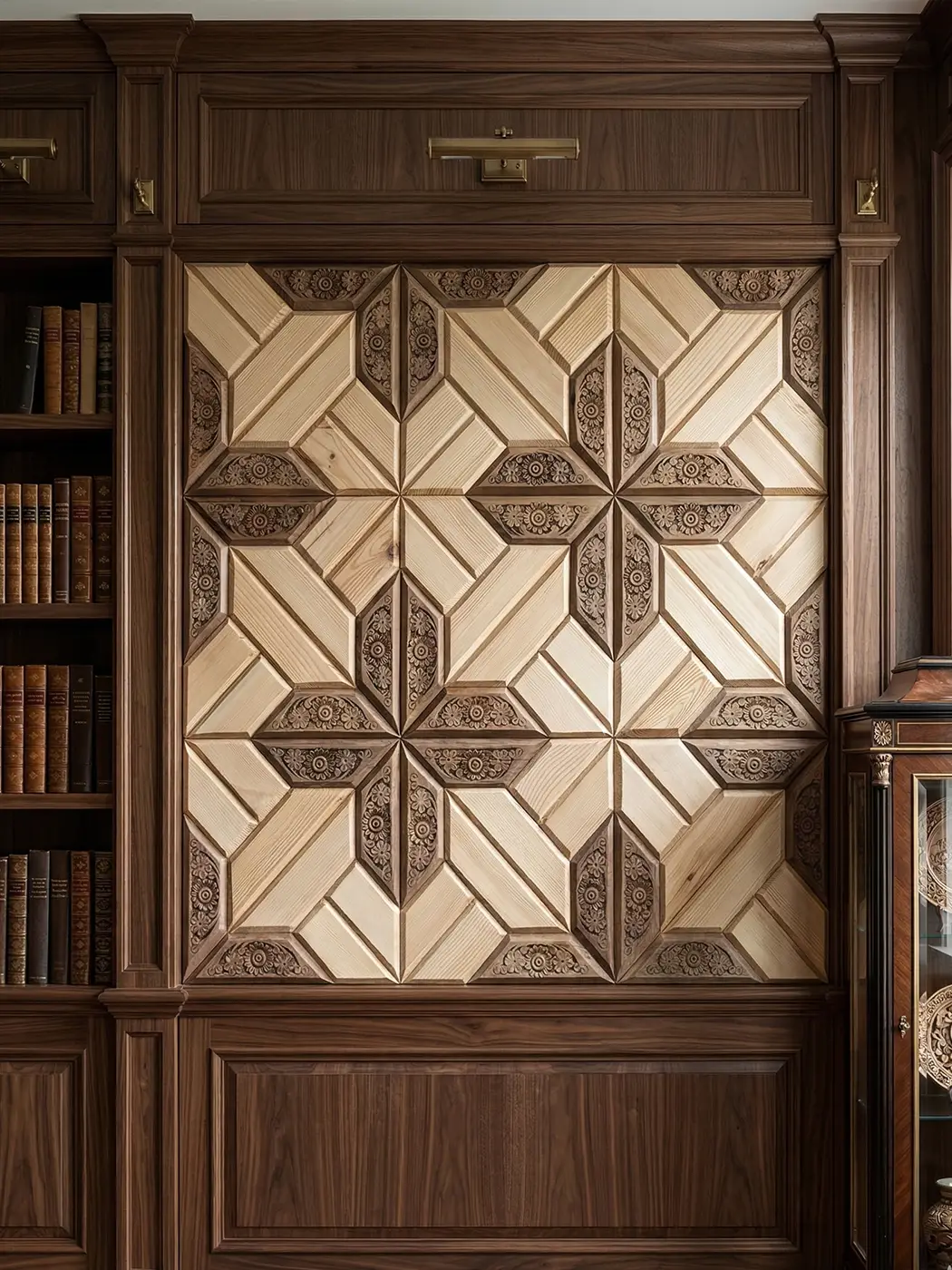 Crafted using walnut (for deep carved detailing) and pine (for lighter contrast) — giving a natural 3D effect.