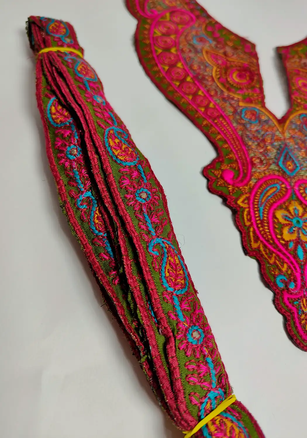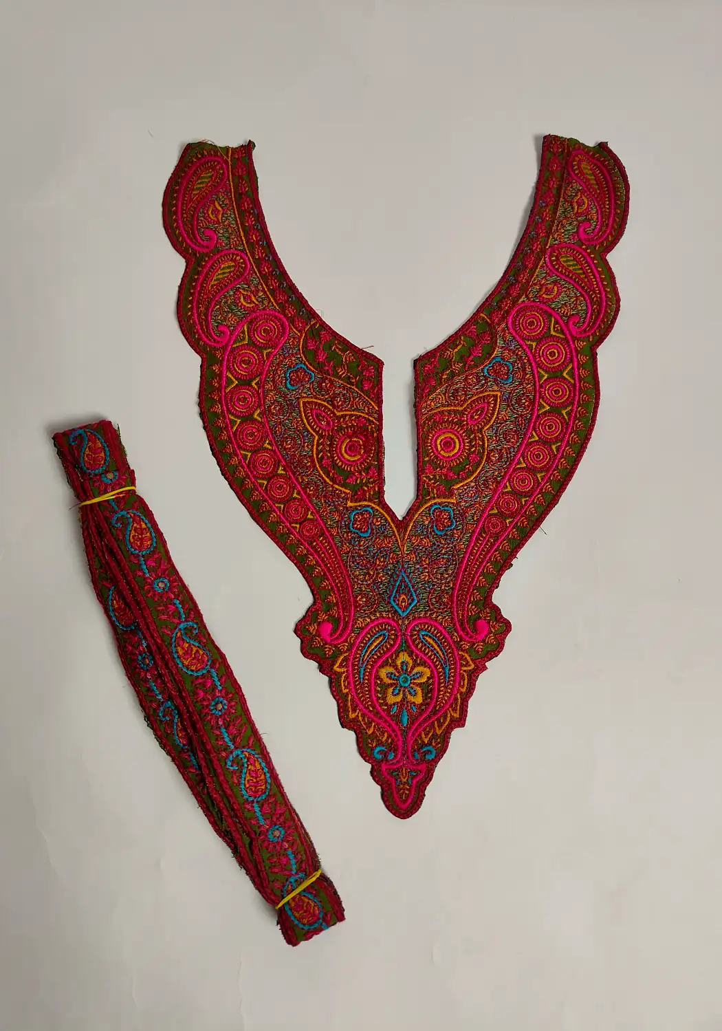 Paisley motif embroidery brings life to this green Kashmiri sozni patch set, spread thoughtfully across the neck, and lace. The detailing feels delicate yet complete, that allows you to design your outfit with ease while keeping a strong connection to traditional Kashmiri craft.