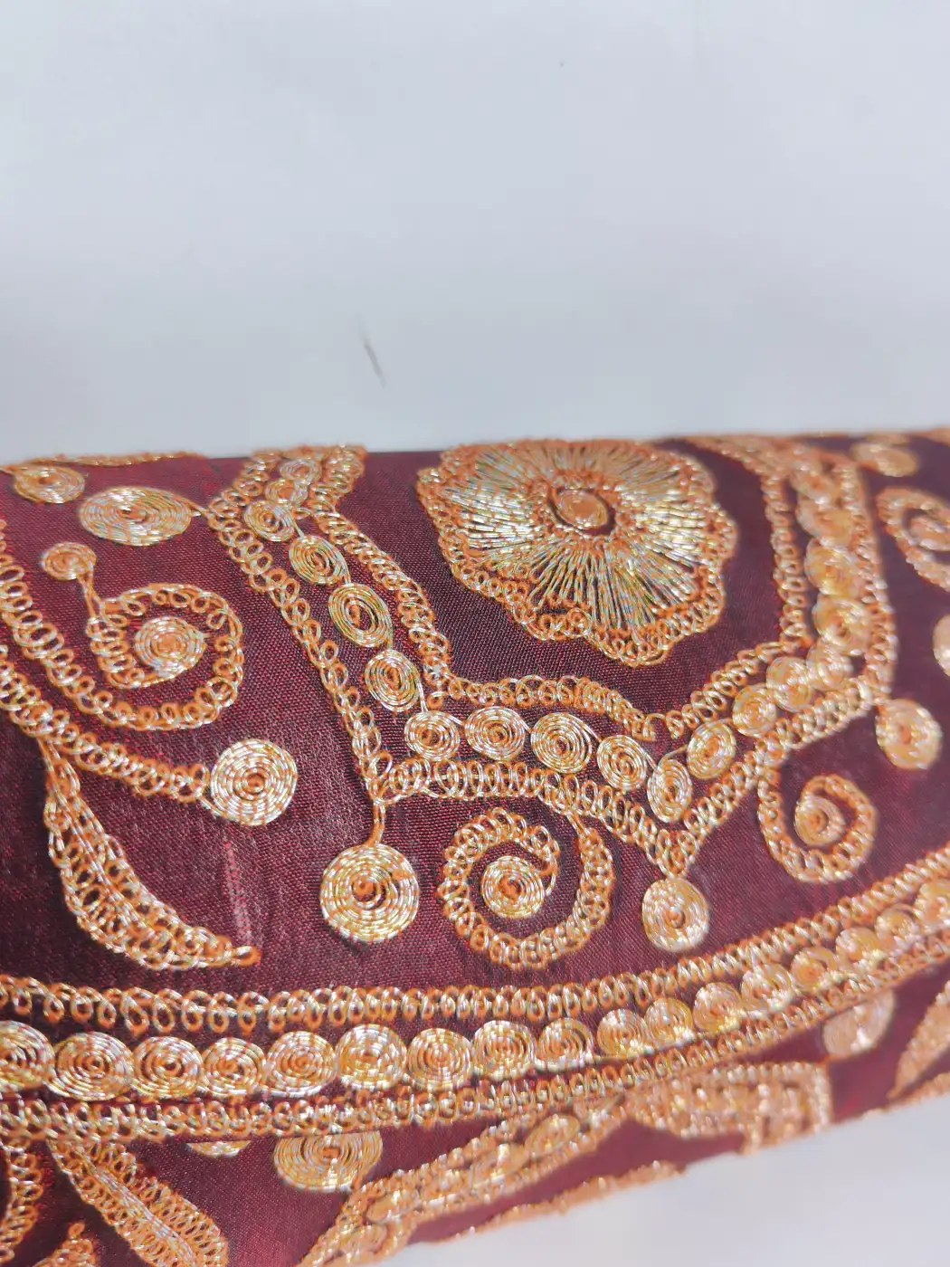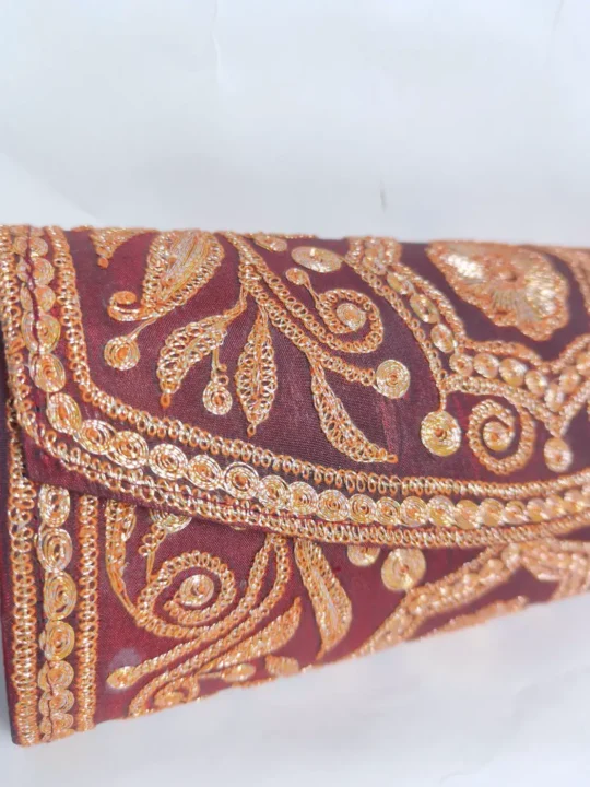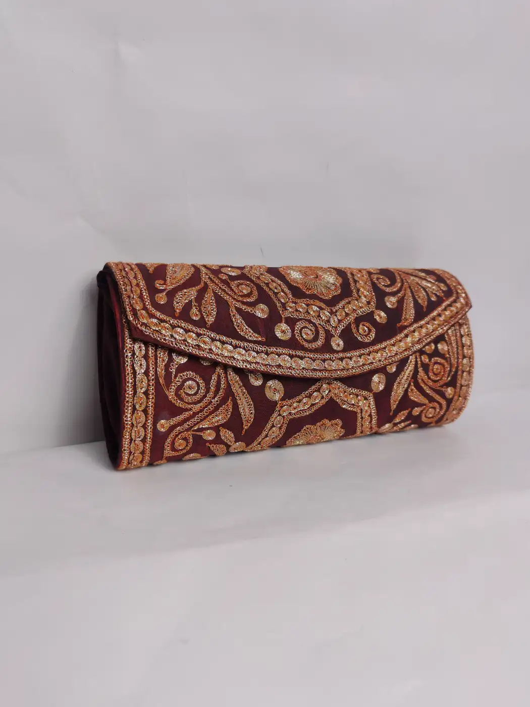 A dense arrangement of floral vines defines this Kashmiri clutch bag, highlighted through botte tilla embroidery. Set on a maroon velvet base, the clutch bag carries a refined traditional appeal, where every motif reflects detailed embroidery and timeless elegance.