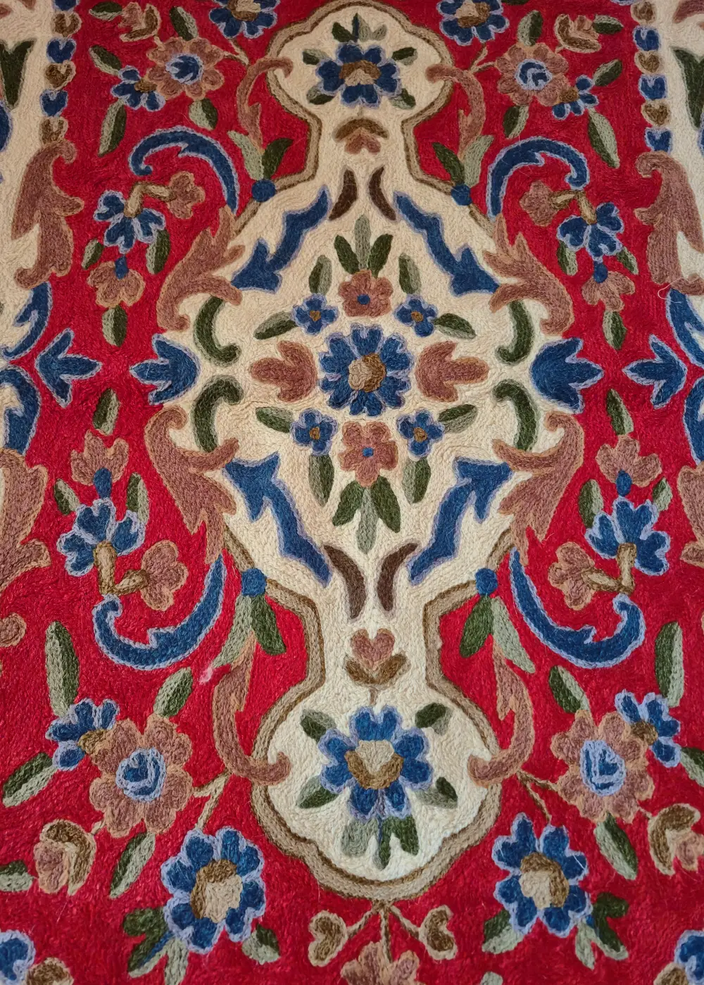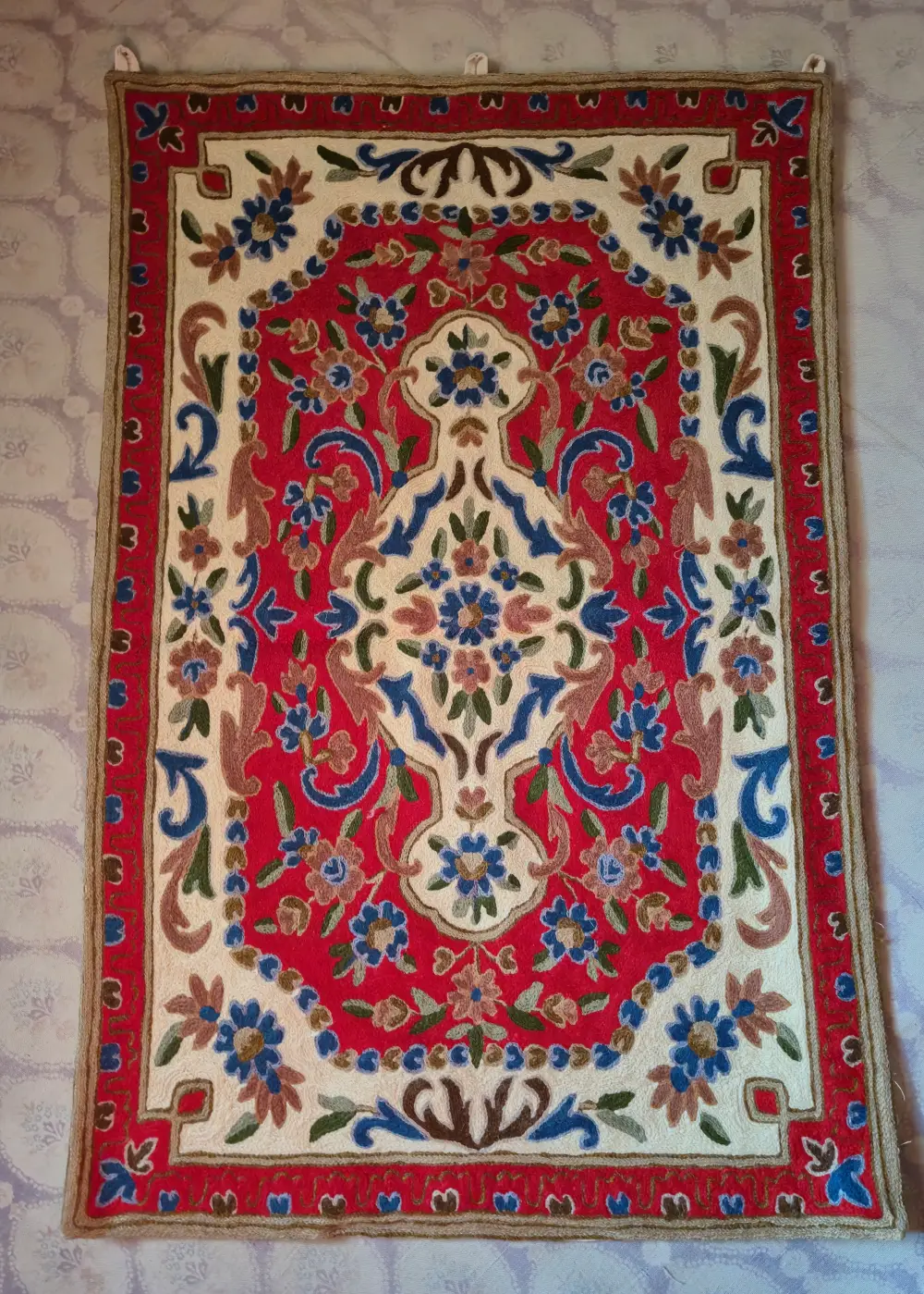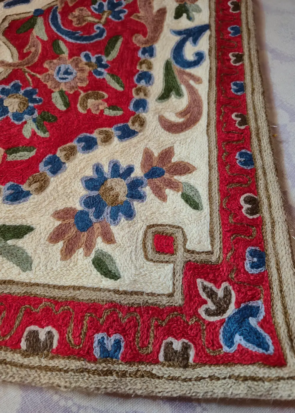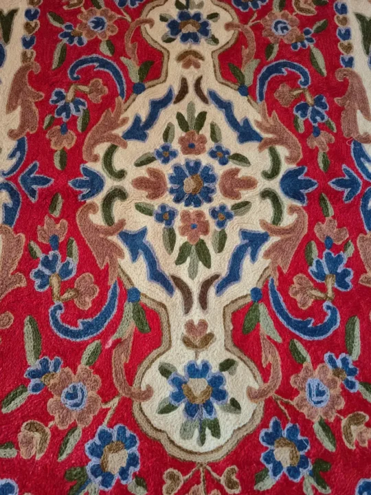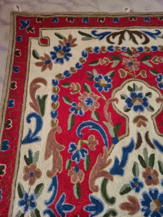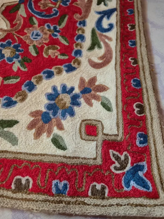 This Kashmiri hand-stitched wall hanging is made on dusoot cotton fabric and finished with detailed wool thread work in a beautiful floral pattern. The detailed chain stitch design fills the whole piece with rich colors and traditional motifs, giving it a elegant handmade and authentic look. It can be used both as a wall hanging to decorate your space or as a small rug to place on the floor or table. The fine chain stitch embroidery design and graceful hand work make it stand out and add a touch of Kashmiri craft to any corner of your home.