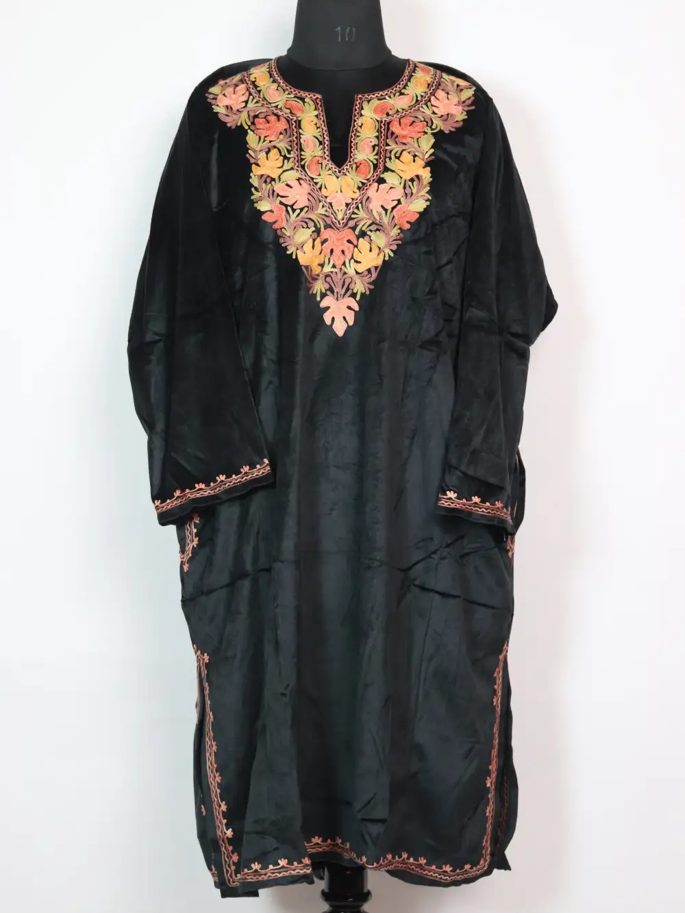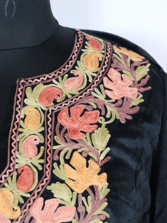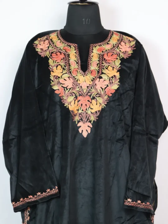 A velvet Pheran in black with delicate Aari along the neckline in pink and orange hue chinar with continuous badam motifs, it measures with a 60 inch chest and 43 inch length for generous layering. This Pheran keeps its neckline subtle yet refined so it reads useful for both daily wear and slightly dressier moments. Youi can pair with plain bottoms to maintain a clean look; this piece will appear among phiran dress searches for buyers who are seeking velvet with tasteful neck embroidery.