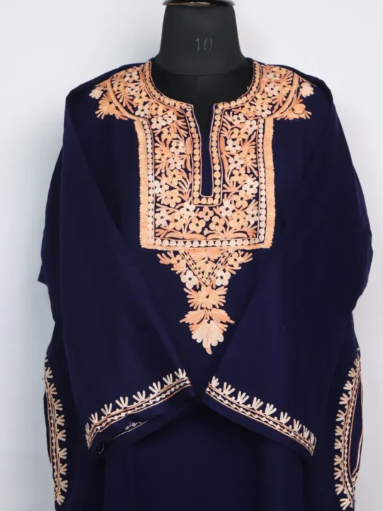 Navy blue premium Cashmilon Wool and aari embroidery at the neckline in floral motifs form a composed Kashmiri phiran that balances warmth and tasteful embroidery. Chest size 54 and length 44 inches provide generous comfort.