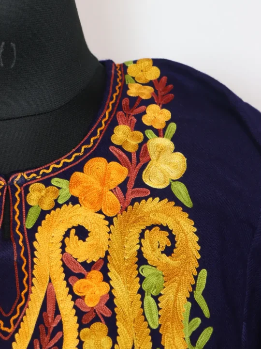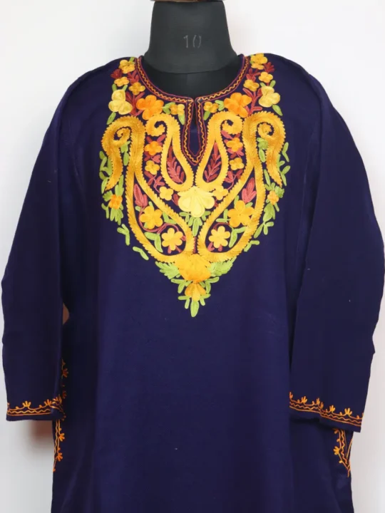 Crafted from cashmilon wool for winter warmth, this kashmiri feran arrives in dark blue colour. It feartures aari embroidery in huge badam patterns that adorns the neckline.