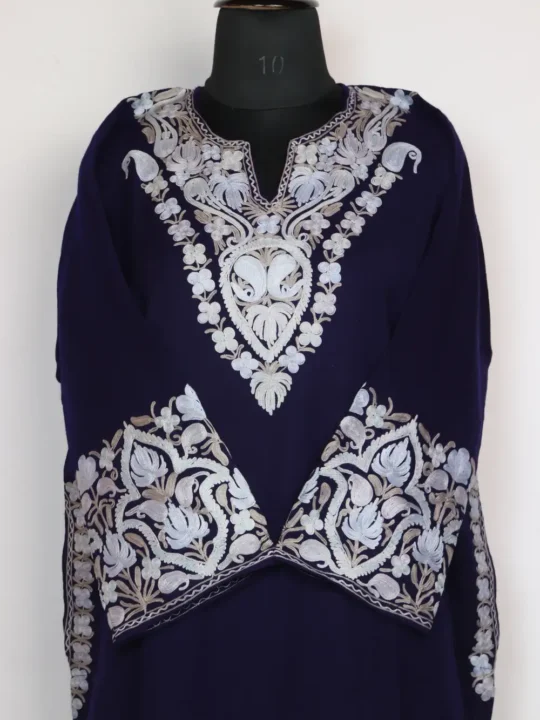 A roomy kashmiri raffal woolen pheran is trimmed with floral Heavy Aari work at the daman, sleeves, neckline and pockets. Chest size 50 and Length 43 create easy layering. The kashmiri woolen phiran presents a modest neck accent and a steady, wearable presence.