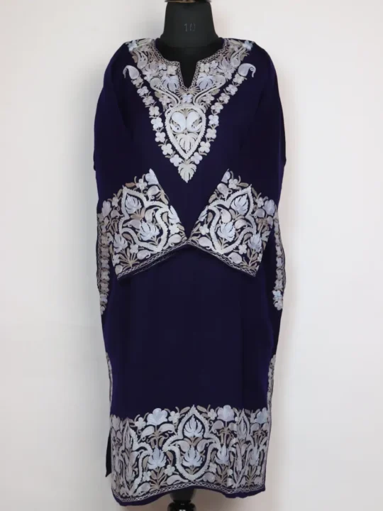 A roomy kashmiri raffal woolen pheran is trimmed with floral Heavy Aari work at the daman, sleeves, neckline and pockets. Chest size 50 and Length 43 create easy layering. The kashmiri woolen phiran presents a modest neck accent and a steady, wearable presence.