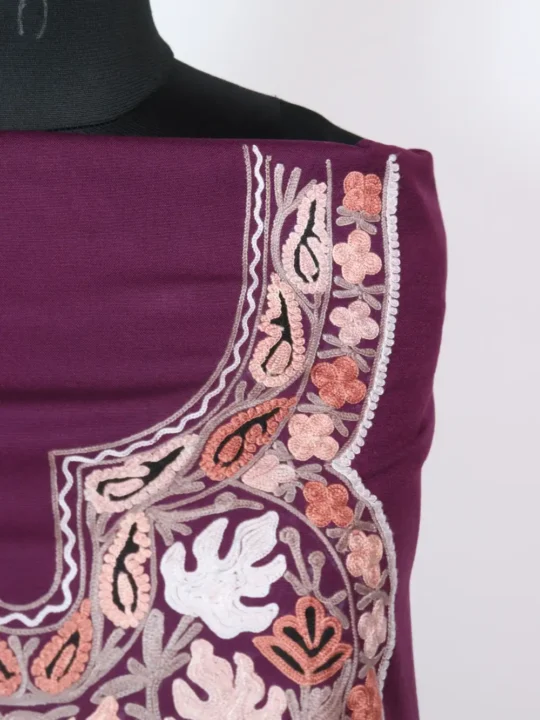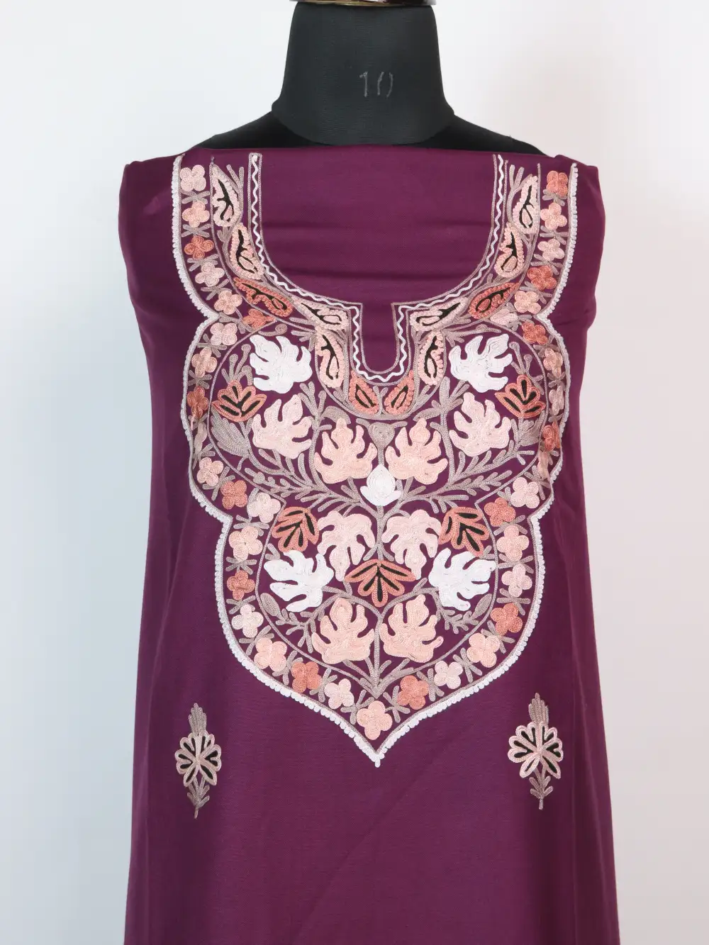 Soft spun fabric forms a warm purple woolen suit offered as a 2pc Suit so that you can stitch to your own fit. Aari embroidery in brown threads creates chinar patterns with tiny badam at the neckline and a floral booti on the front panel, all described in careful detail. This 2pc Suit is comfortable and refined, and it sits naturally among woolen Kashmiri unstitched suits perfect for spring, autumn.