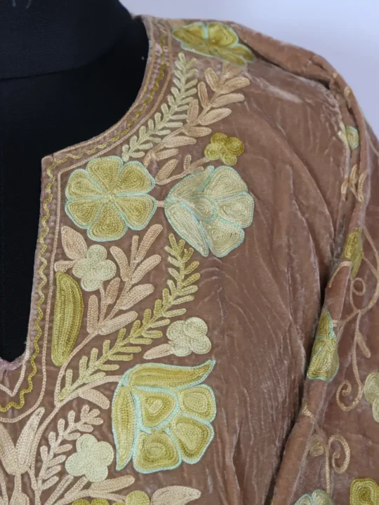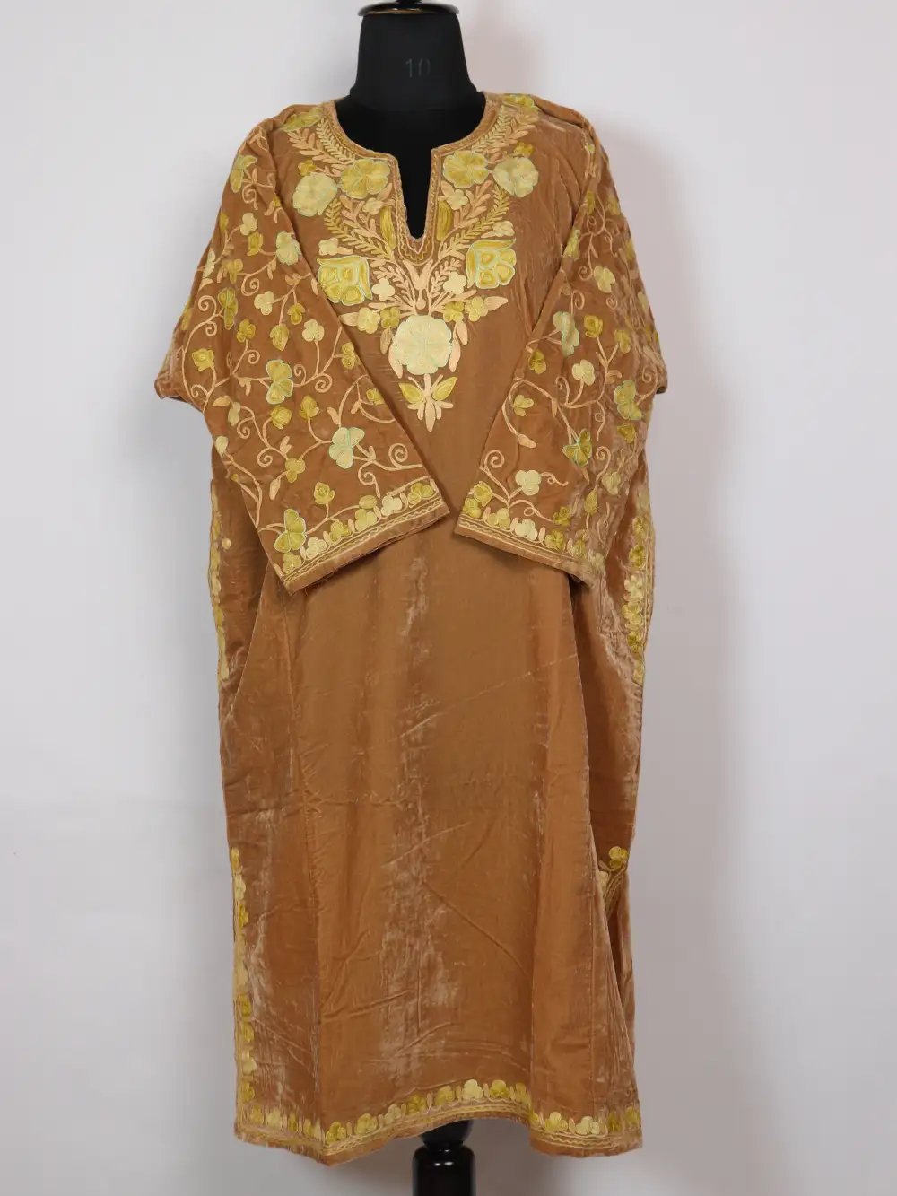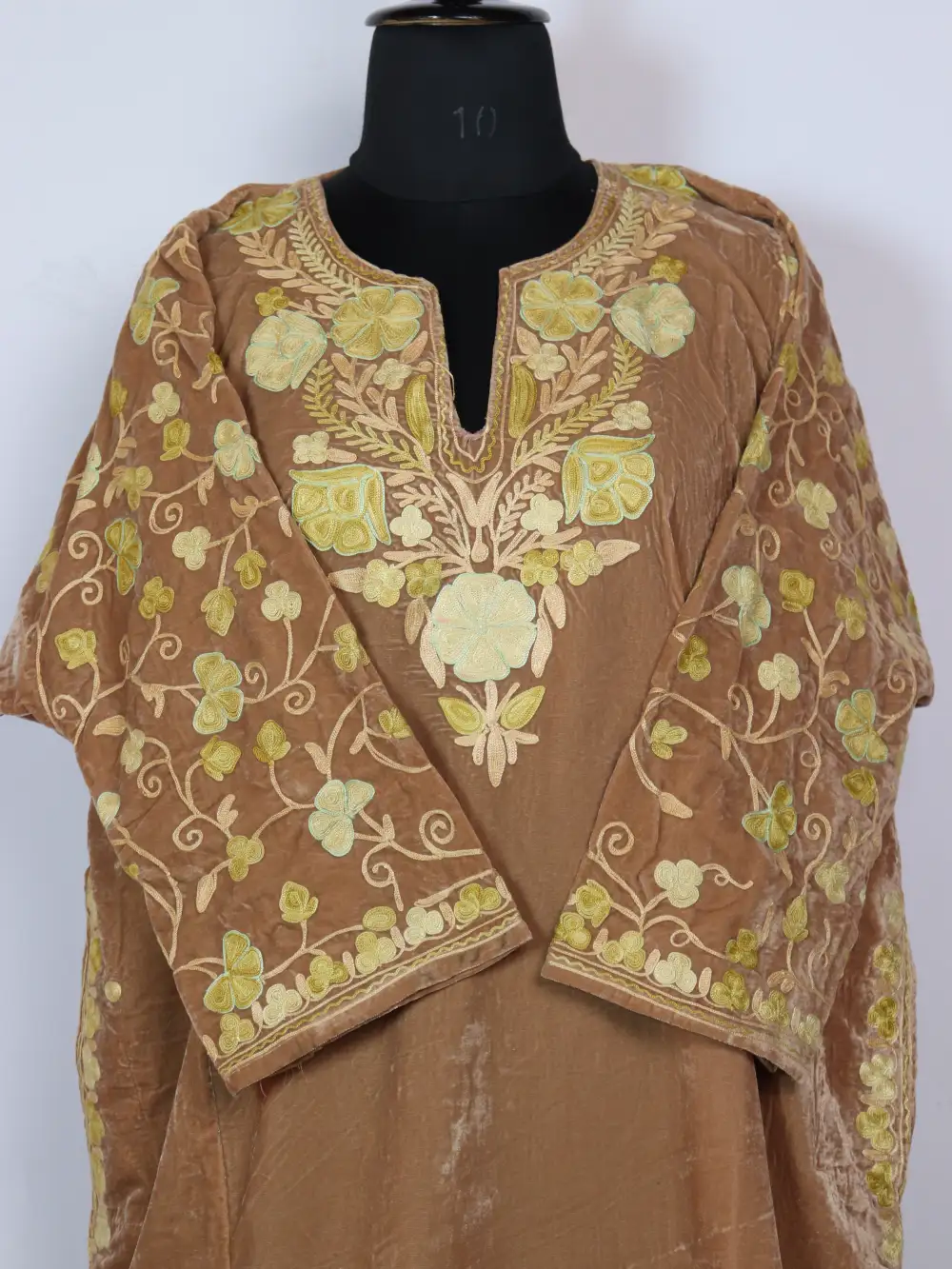Elegant velvet and beautiful Aari embroidery make this beige Kashmiri pheran an exquisite winter ensemble. Floral embroidery at the neckline and vine floral on sleeves with light green threads enhances its festive charm. You can order this pheran that comes in 54 inches chest size and 46 inches length online at just 2699 to enjoy a blend of comfort and style. Our stylish Kashmiri feran collection celebrates winter fashion beautifully.