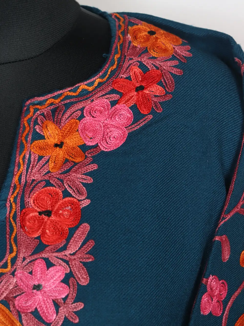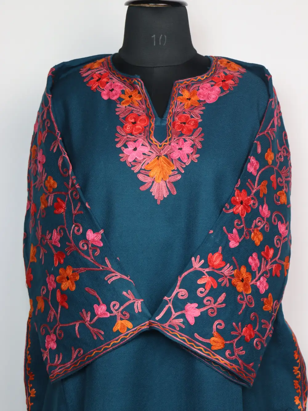 This pheran is crafted from warm cashmilon wool, with detailed floral aari kadhai near the neckline and detailed jaal work across the sleeves.