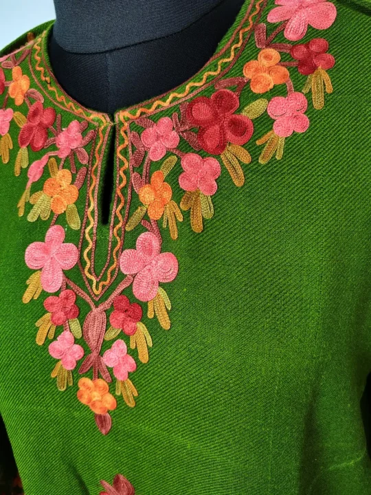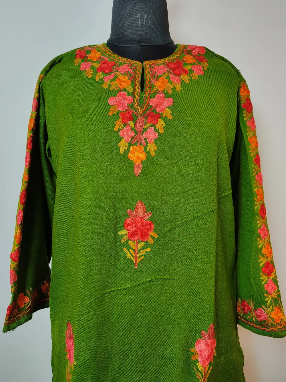 Curated as a comfortable 2pc kurti set with kurti and trouser, this new design woolen kurta set comes in green cashmilon wool. Soft floral aari embroidery decorates neckline and all over the kurti with bootis.