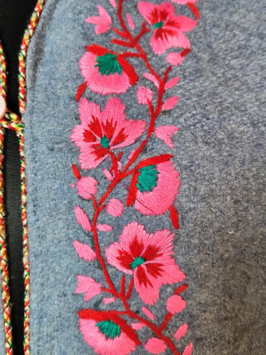 Designed using blazer tweed to suit cold days, this women’s coat comes in grey colour. Its floral aari embroidery highlights border and front panel vertically.