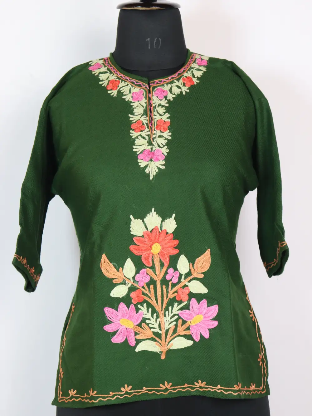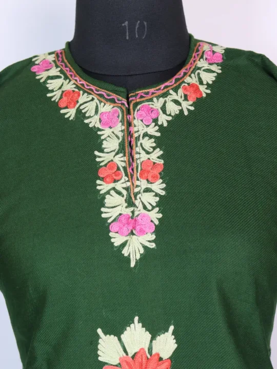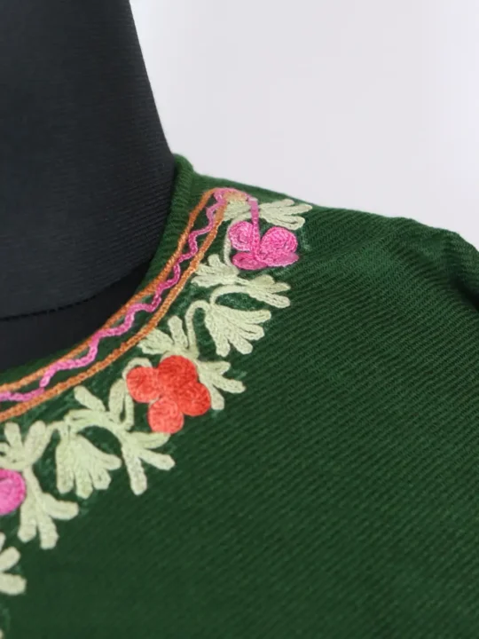A charming baby girl woolen dress, this Kids Kurta in green Cashmilon wool features floral Aari embroidery at the neckline and large floral motifs across the front panel. Made for 3-4 year old girls, the Kids Kurta carries subtle Kashmiri kadhai and comfortable winter warmth.
