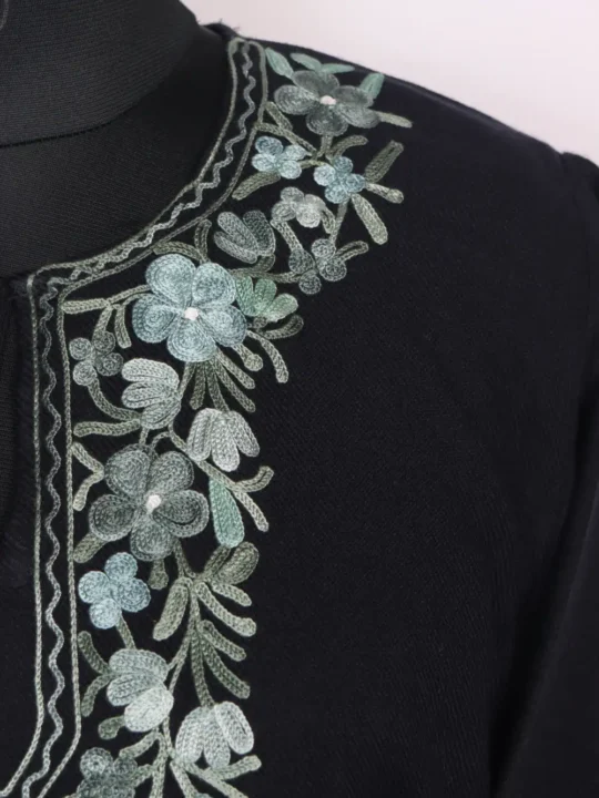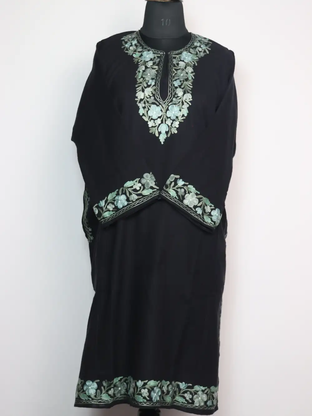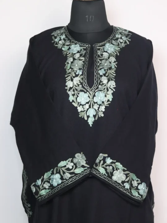 This cashmilon wool pheran feels soft and warm, perfect for chilly days. It comes with elegant embroidery that adds a gentle traditional touch.