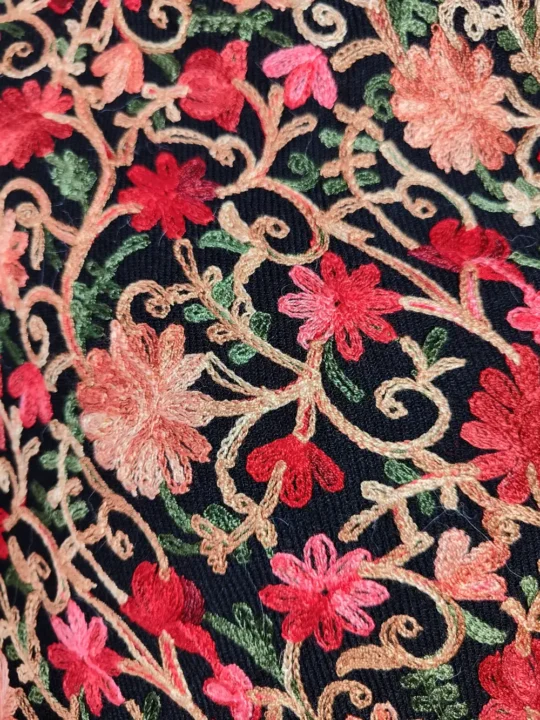 Wrapped in warmth and softness (narmi), this jama Poncho with black fur in black Cashmilon wool is perfect for winter elegance. Its Aari embroidery spreads floral red and brown hues across the body, lending a graceful tone to your everyday wear. Measuring 43 inches across and 35 inches in length, it comes with no lining. This Poncho brings comfort with charm, and makes it ideal for women who love the feel of Kashmiri poncho with fur.