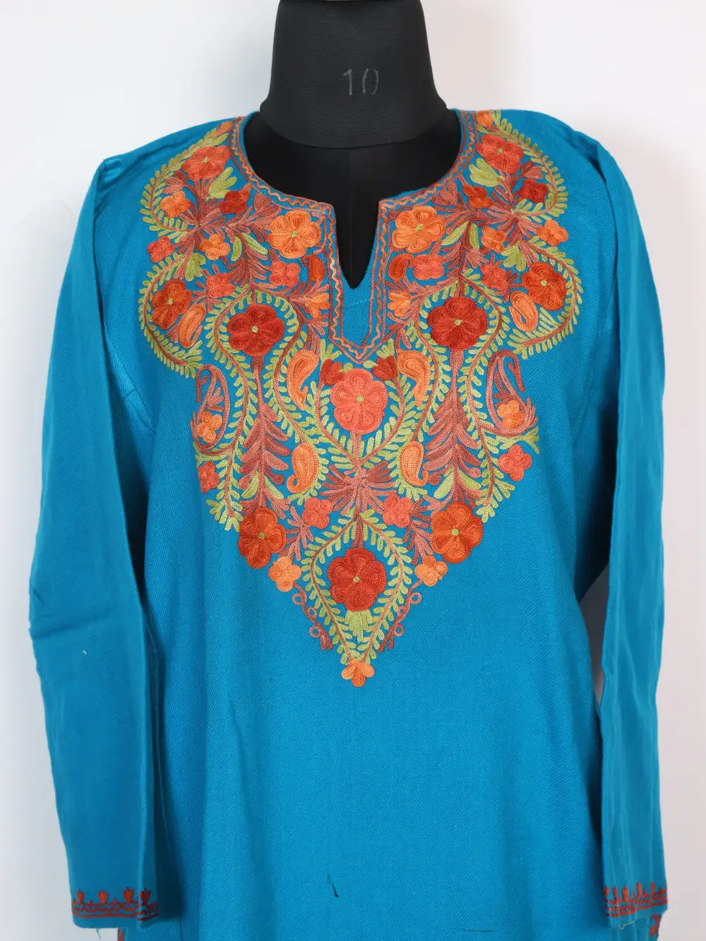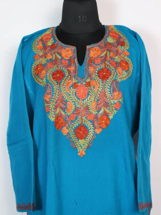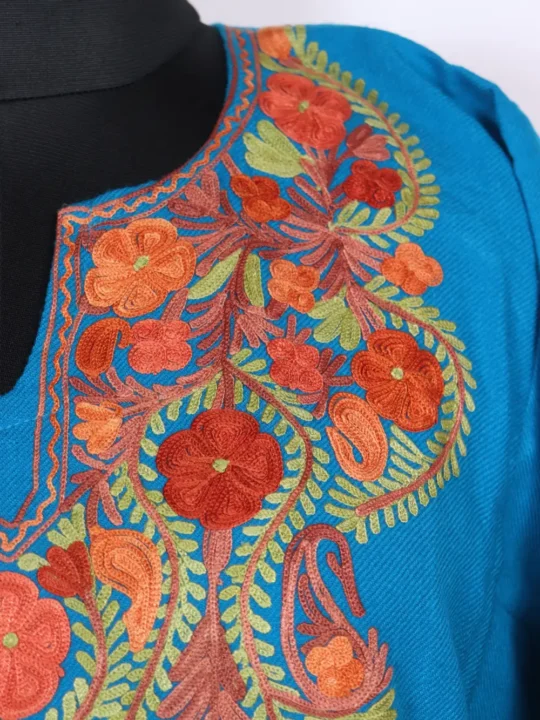 Soft Cashmilon wool in blue with curved floral Aari on the neckline and two pockets on both sides add everyday convenience. This Pheran layers easily and appears under stylish kashmiri feran suggestions for women who like taditional accents.