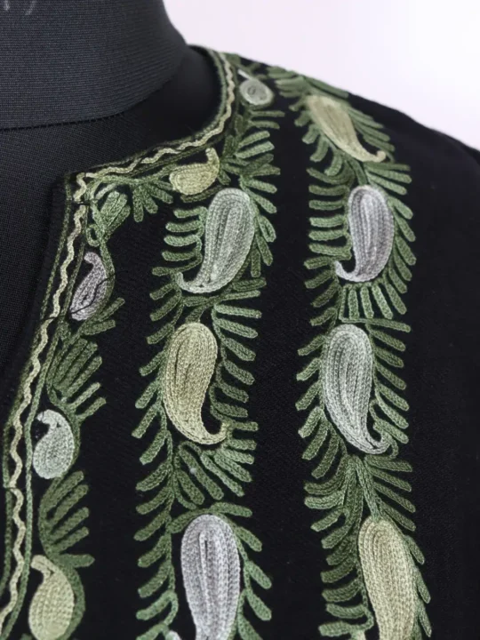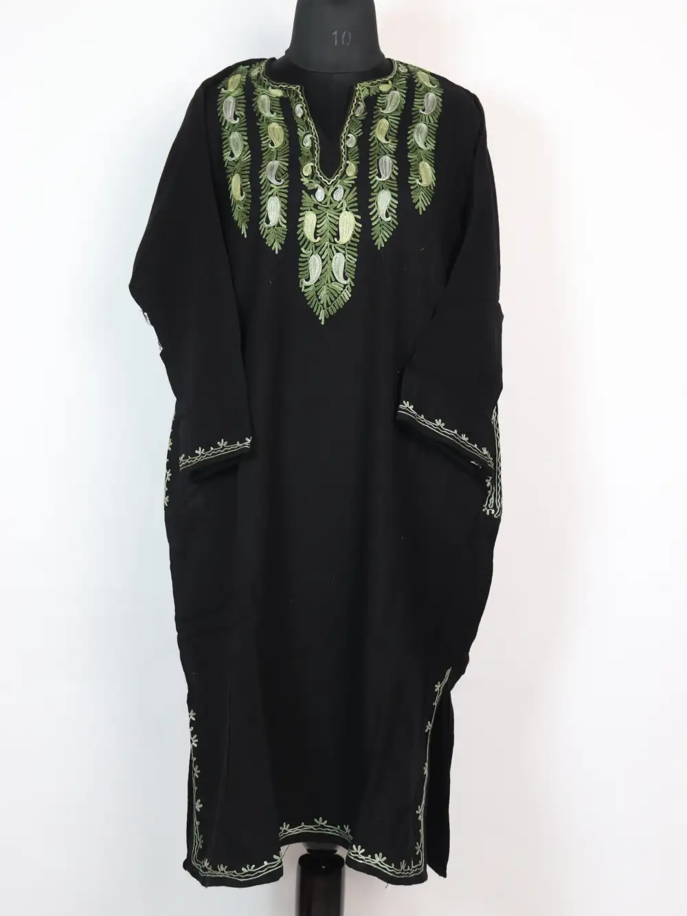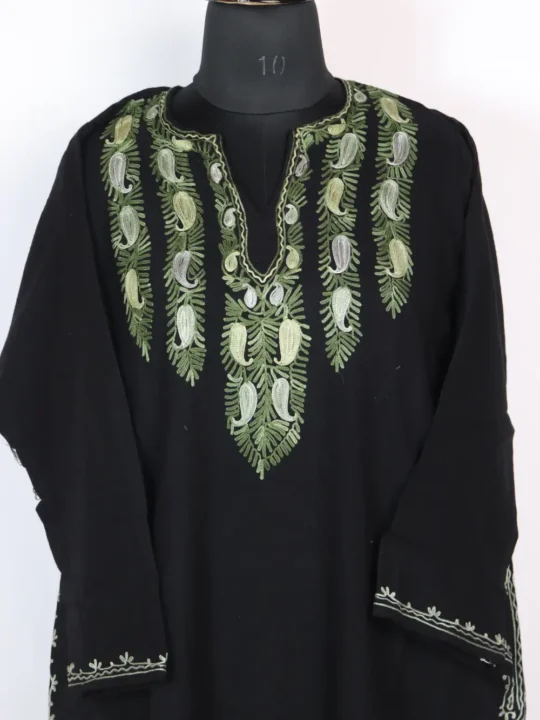 Cashmilon wool and Aari embroidery meet softly on this black Kashmiri Pheran, it is embroidered with continuous badam work at the neckline in striped design. This Phiran adds warmth with grace — explore our Kashmiri woolen phiran range to order yours online.