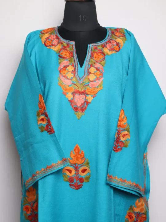 Crafted in Cashmilon wool. This blue Kashmiri pheran feels warm and wearable, it is adorned with Aari embroidery at the neckline in floral an chinar motifs and the panels in booti style.