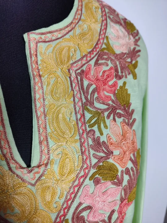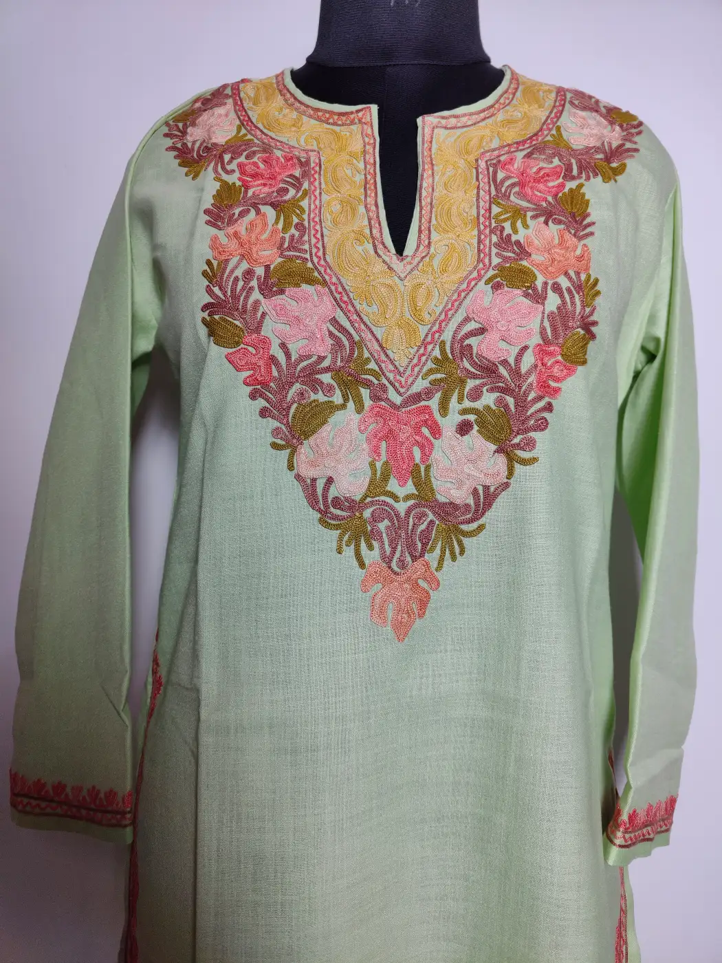 Designed in black ruby cotton, co-ord set presents Kashmiri charm through a matching kurti and trouser combination. Floral aari embroidery highlights the neckline gracefully. Co-ord set comes with chest size 42 and length 40, ensuring ease with traditional Kashmiri style.