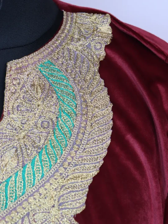 Exquisite Holland Velvet pheran in maroon hue with Zari Tilla embroidery along the neckline showcases chinar shape huge floral motifs, which adds a touch of Kashmiri elegance. It comes in 60-inch chest size and 45-inch length, this Pheran blends warmth and heritage in a single, graceful winter wardrobe piece