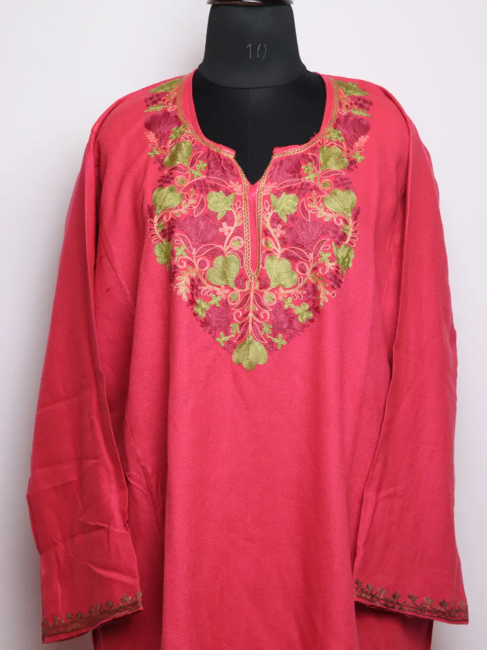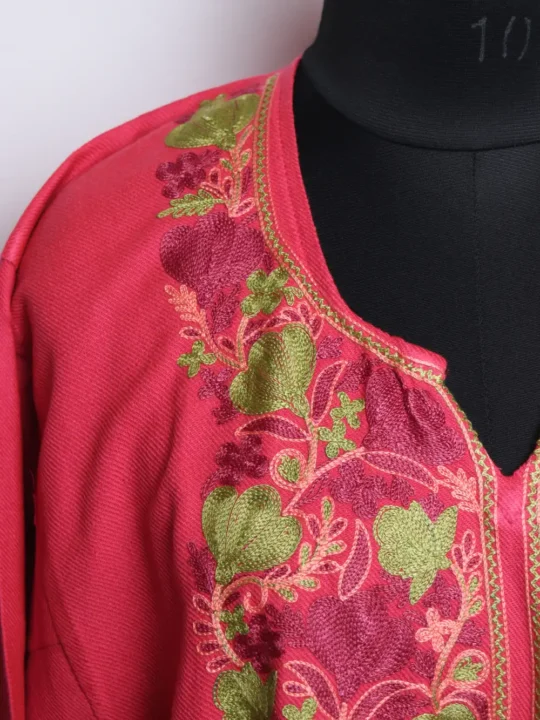 This cashmilon pheran has a detailed floral aari kadhai placed around the neckline.