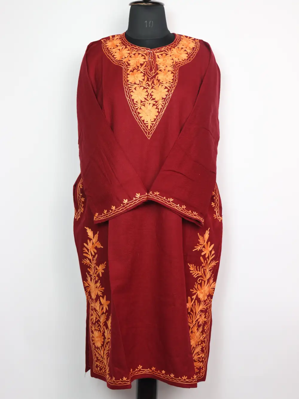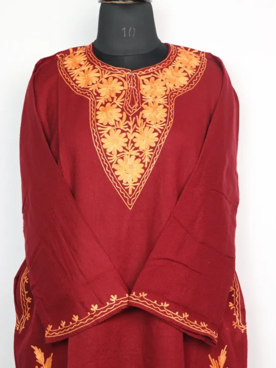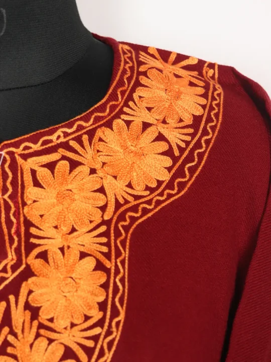 Cashmilon wool stylish Kashmiri pheran displays Aari kaam at the neckline where layered blossoms are stitched to create a floral motif. It also showcases booti style kadhai at side borders. It has chest size 50 inches and length 43, that offer roomy proportion.