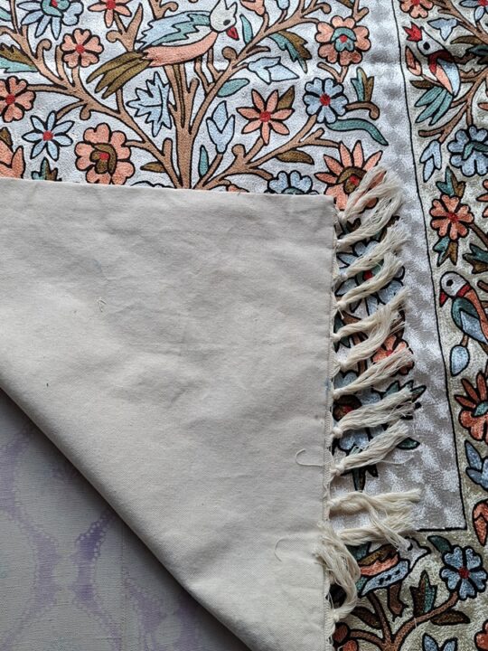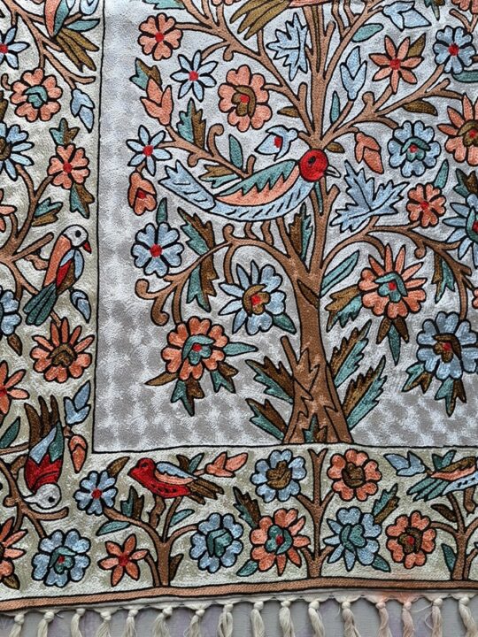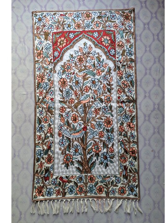This wall hanging represents Kashmiri culture with a detailed Tree of Life design and colorful flowers and birds that were hand-stitched by skilled Kashmiri artisans. Each stitch tells a story of tradition and craftsmanship.