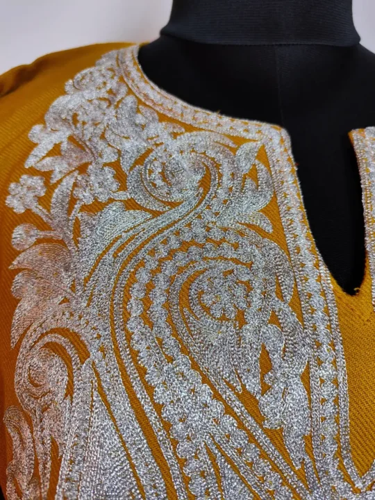 This elegant mustard yellow pheran is made from soft Cashmilon fabric, and it showcases the intricate beauty of Zari embroidery. It is a perfect addition to your winter wardrobe as it blends warmth, comfort, and timeless Kashmiri artistry.