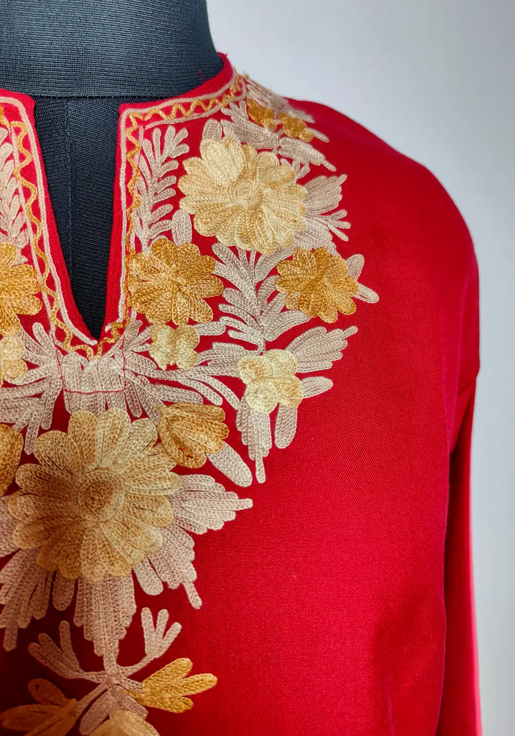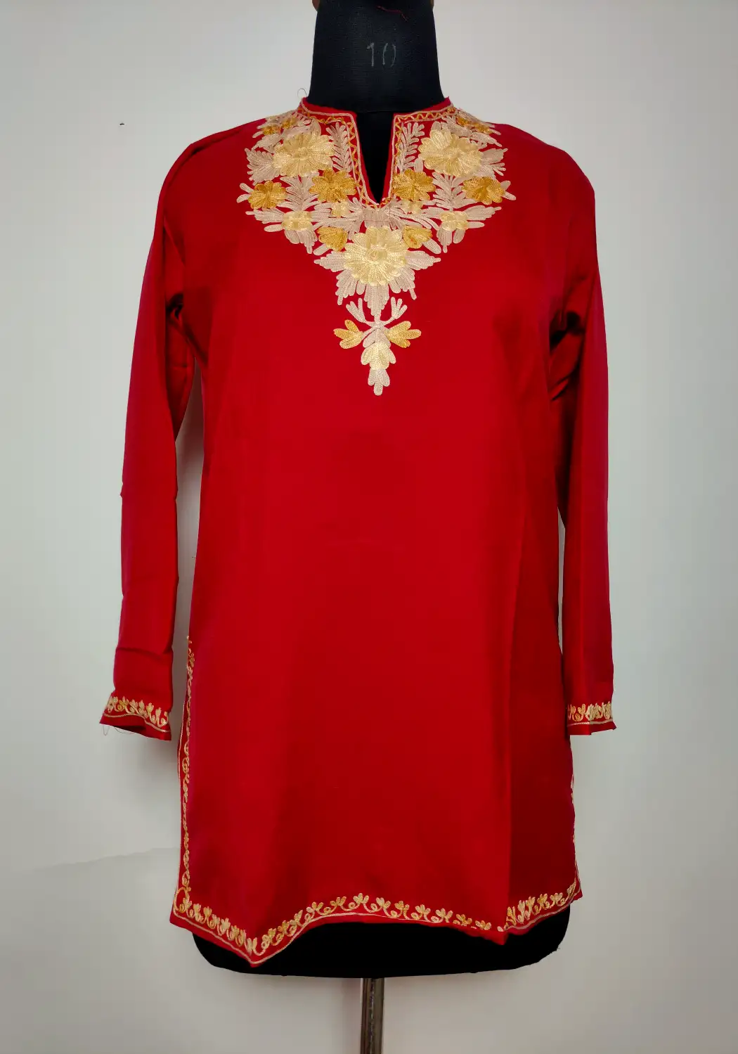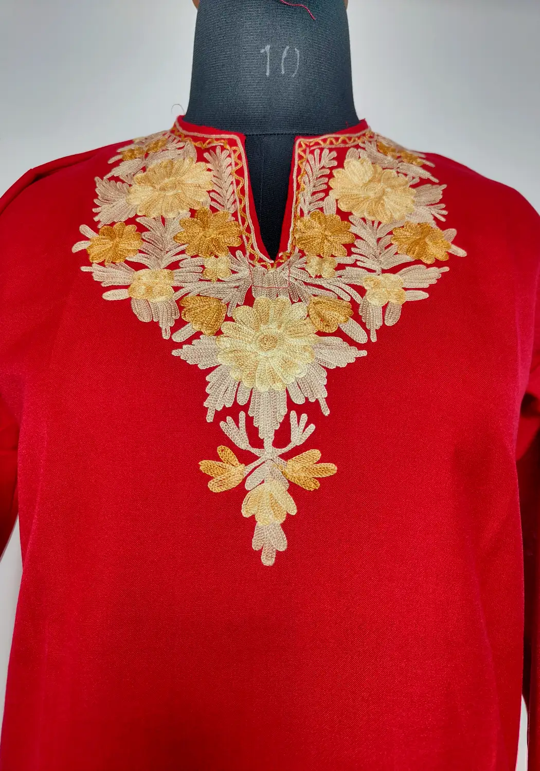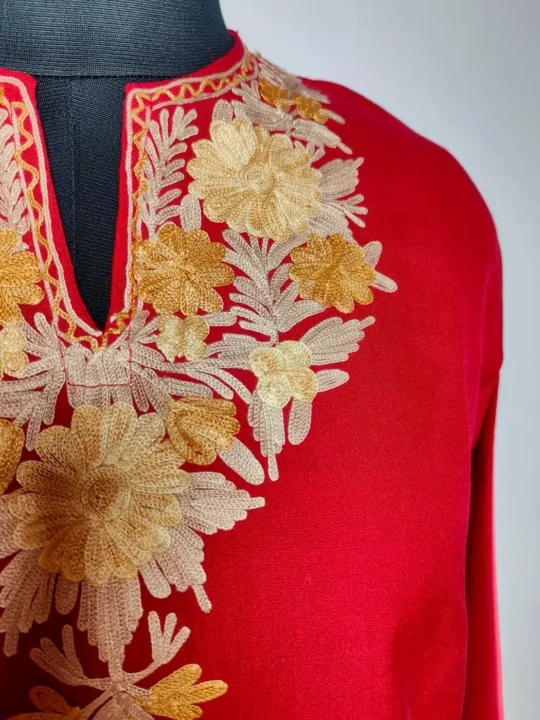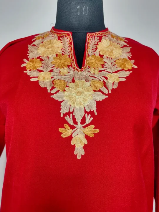 Soft summer cool cotton shapes this maroon aari work kurti, which makes it comfortable for long wear. The neckline is adorned with floral embroidery, adding a refined detail. It feels simple, light, and quietly elegant with its Kashmiri inspired touch.
