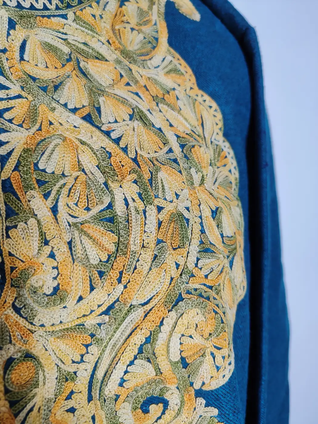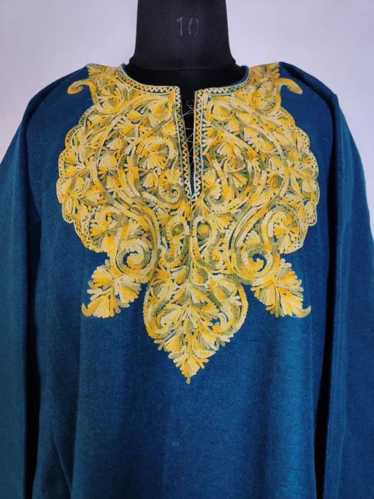 Crafted in oceanic blue tweed wool, this Stylish kashmiri pheran reflects Kashmiri warmth with a rich winter feel. Its floral badam aari embroidery highlights the neckline neatly.