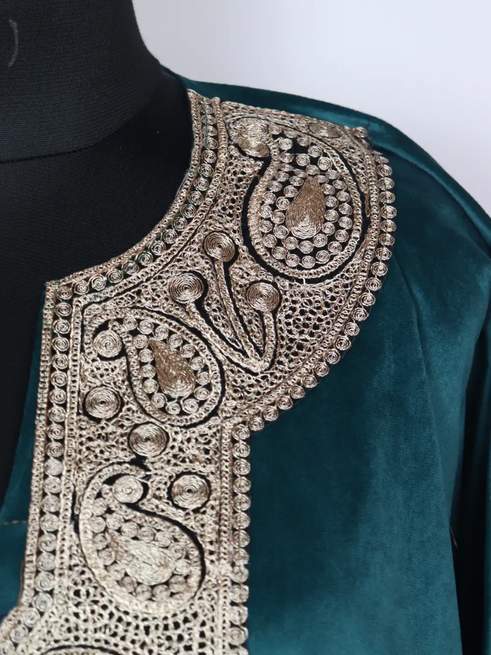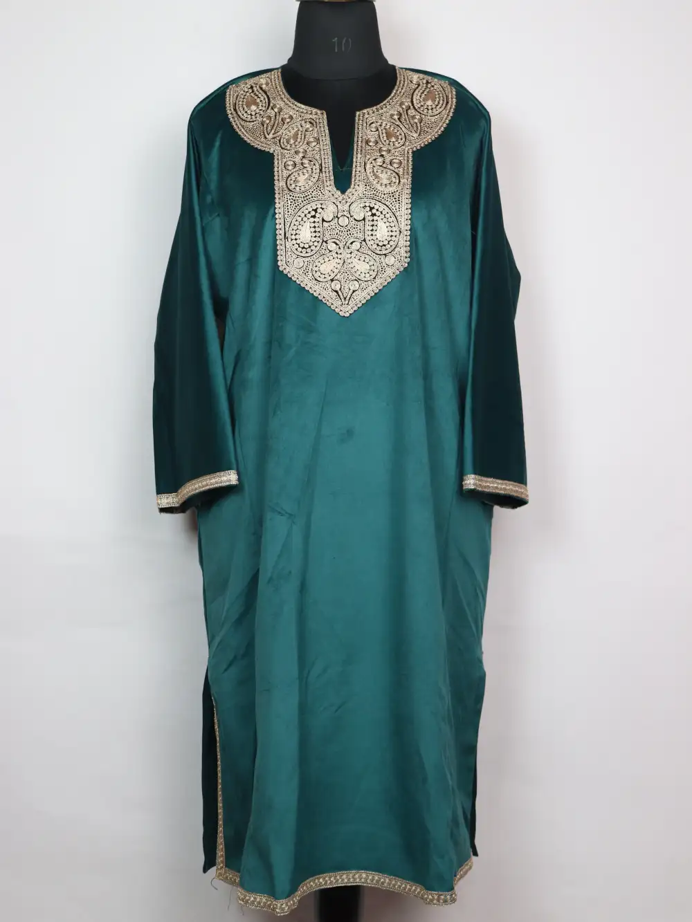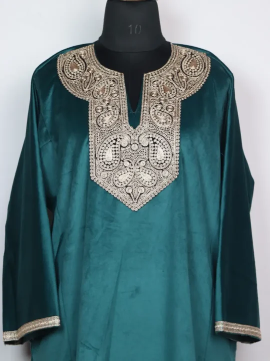 A soft Holland velvet pheran with zari tilla badam work at the neckline for a classic Kashmiri look. The fit is relaxed with a 52-inch chest and 45-inch length, making it comfortable for long winter days. It has a simple and elegant feel.