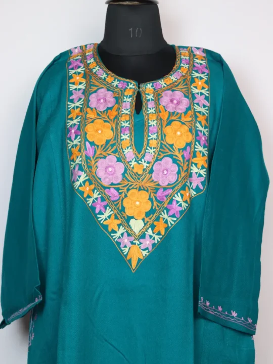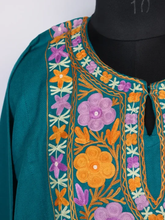 The neckline has elegant floral aari kadhai in beautiful pattern, and the cashmilon makes it easy and comfortable to wear.