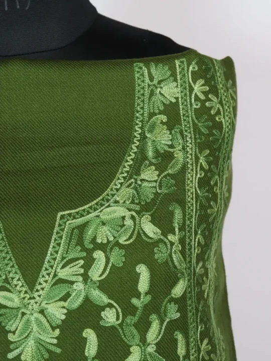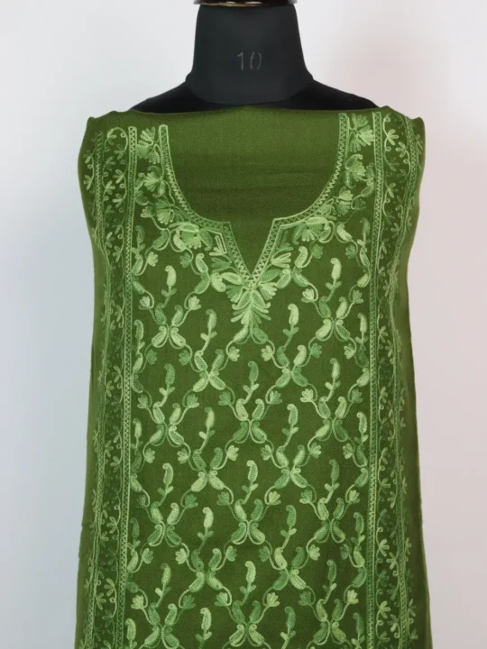 Front panel fully have been embroidered with green badam in geometrical patterns all over this garam suit. This green 2pc Suit in cashmilon wool provides a warm woolen suit option for winter. It is offered unstitched, so that it can be tailored to your preference. The Aari embroidery elevates its classic look, placing it among kashmiri garam suit and full embroidery suits. It is practical, cozy, and decorative, and this 2pc Suit is a winter essential.