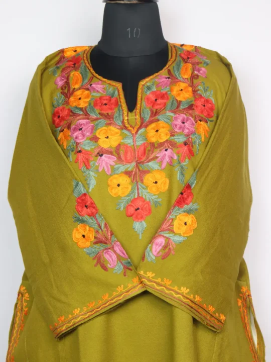 Cashmilon wool phiran dress showcases floral aari embroidery along the front back neckline, sleeves and daman corners. This dress in black comes with chest size 52 and length 44 inches.