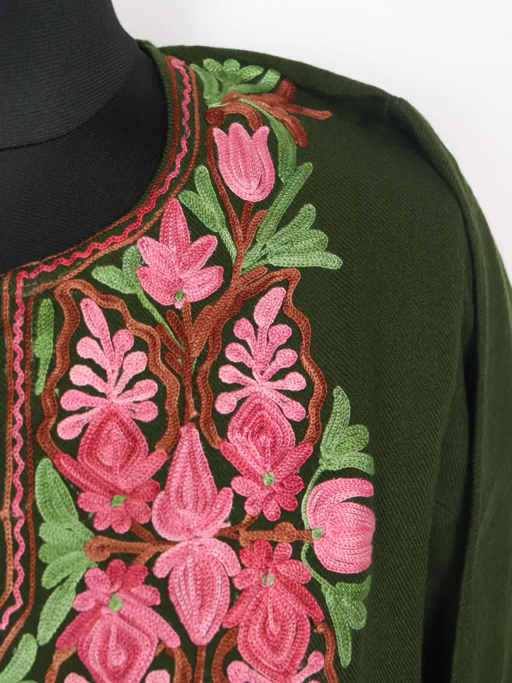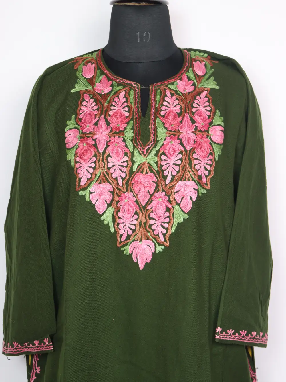 Cashmilon wool kashmiri traditional pheran in green hue balances neat tailoring with everyday practicality. It features pockets on both sides so the piece fits modern use. Aari embroidery at the neckline arranges floral motifs which lift the front with subtle Kashmiri poise.