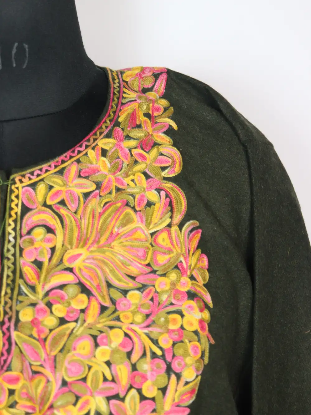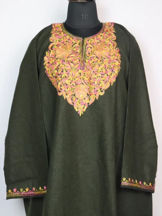 The posh bagh aari embroidery around the neckline adds a small, graceful highlight to the natural look of this tweed firan.