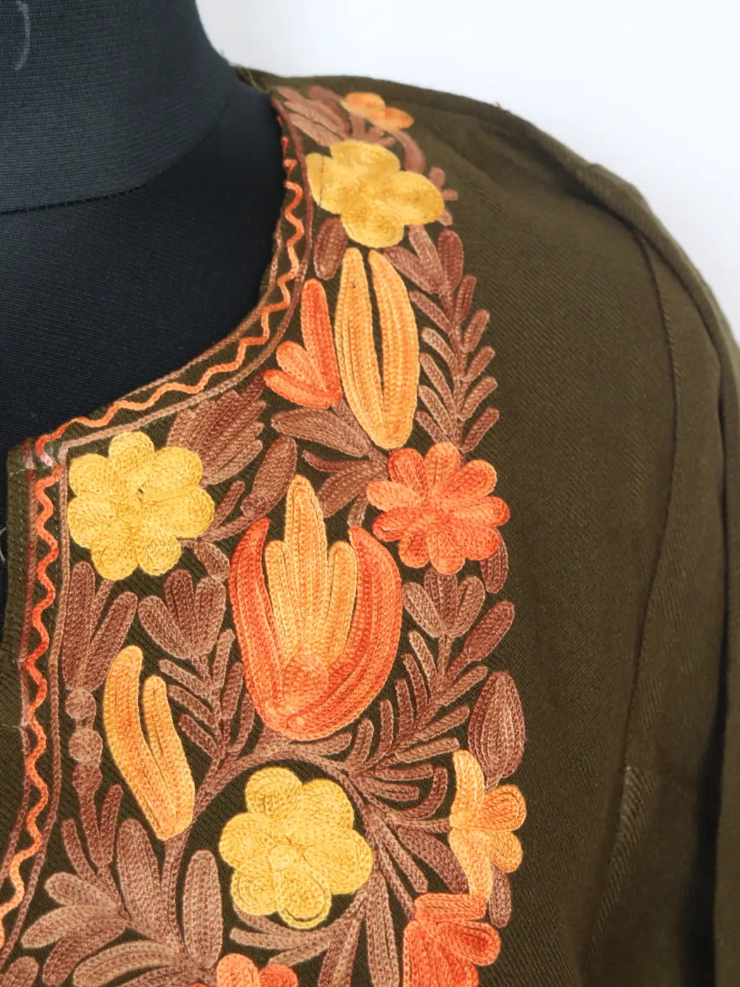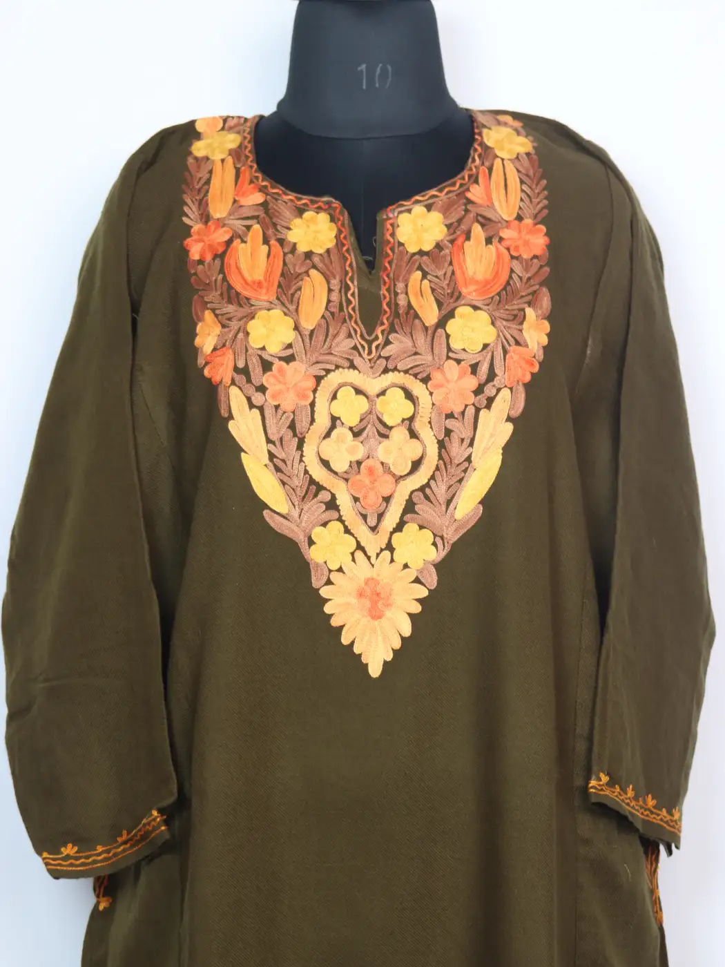 Crafted in cashmilon wool for warmth, this stylish kashmiri pheran comes in olive green colour. It carries aari embroidery in floral patterns at neckline.