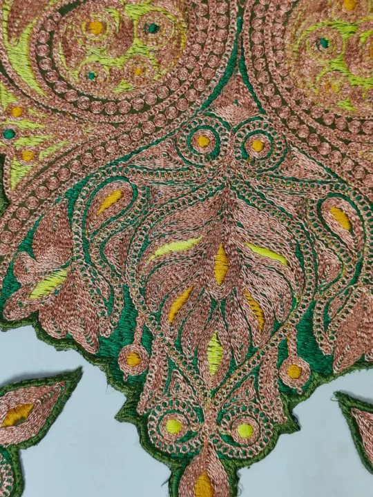 Featuring tilla embroidery on olive green fabric, this patch express Kashmiri style. It brings new life to pherans, kurtis, or shirts.