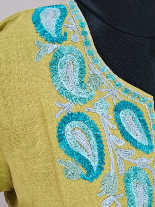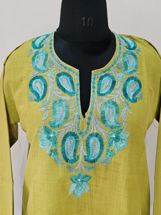 This olive green color short Ruby Cotton kurti blends everyday ease with its timeless charm of Kashmiri Aari embroidery. The breathable fabric makes it ideal for daily wear, while the threadwork lends it a graceful, ethnic finish. The embroidery features neckline badam motifs with blue threads. Whether you pair it with trousers or wear as a standalone piece, it will always bring quiet elegance into your look.