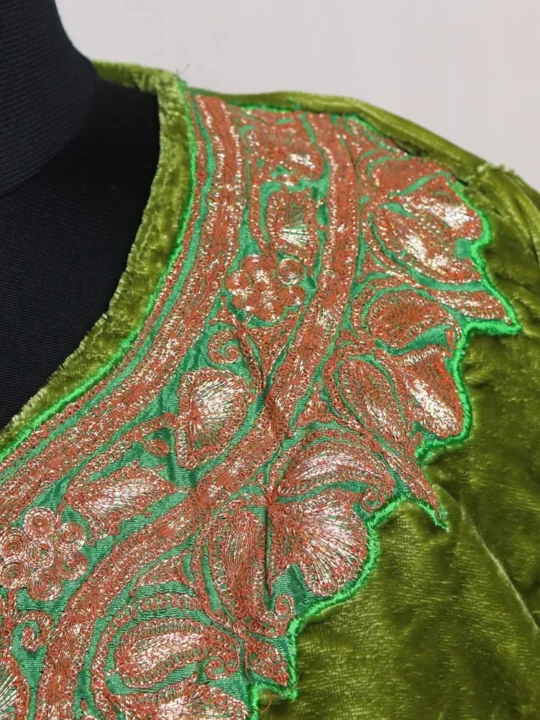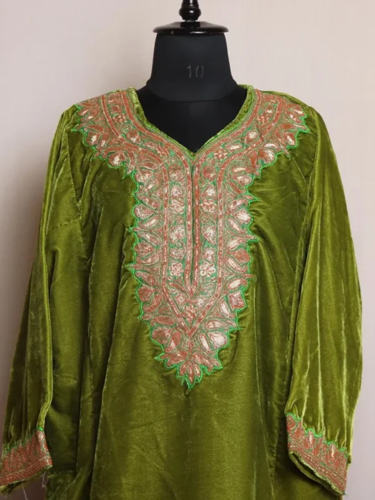 This olive green colored velvet pheran showcases detailed Tilla embroidery. It offers a stunning combination of style and comfort. Thia velvet fabric provides warmth and coziness, and it is ideal for cold winter days. Its exquisite Tilla work enhances its elegance, which makes it suitable for both everyday wear and special occasions
