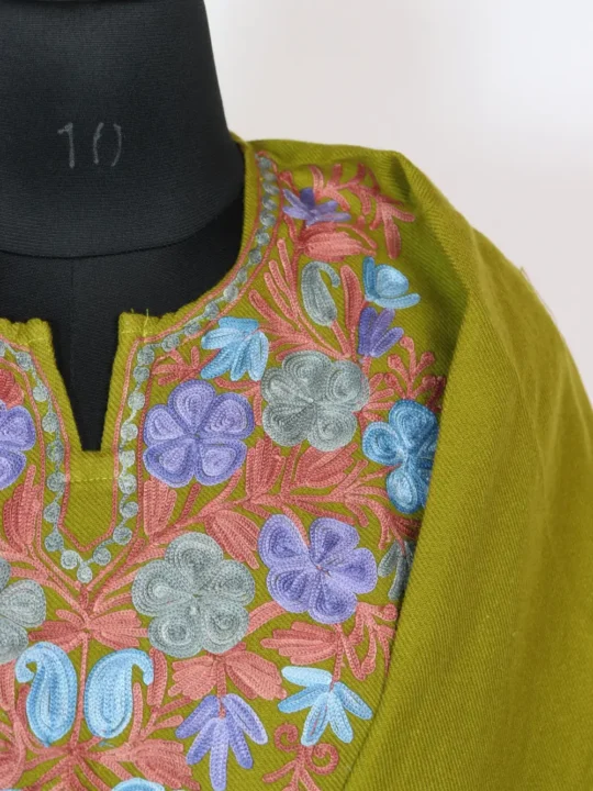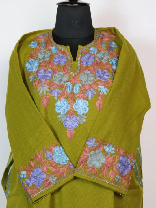 Neat floral Aari at the neckline, sleeves and borders in purple, grey and green threads makes this Cashmilon wool garam feran quietly decorative while the 52 inch chest size and 42 inch length gives it a comfortable fall. This pheran presents a traditional look with modern ease and pairs easily with plain bottoms. If you wish to add Kashmiri phiran dress to your wardrobe, you can order this pheran online at 1699 for a simple and elegant upgrade.